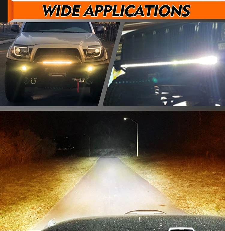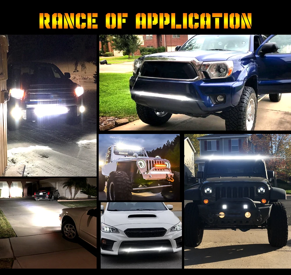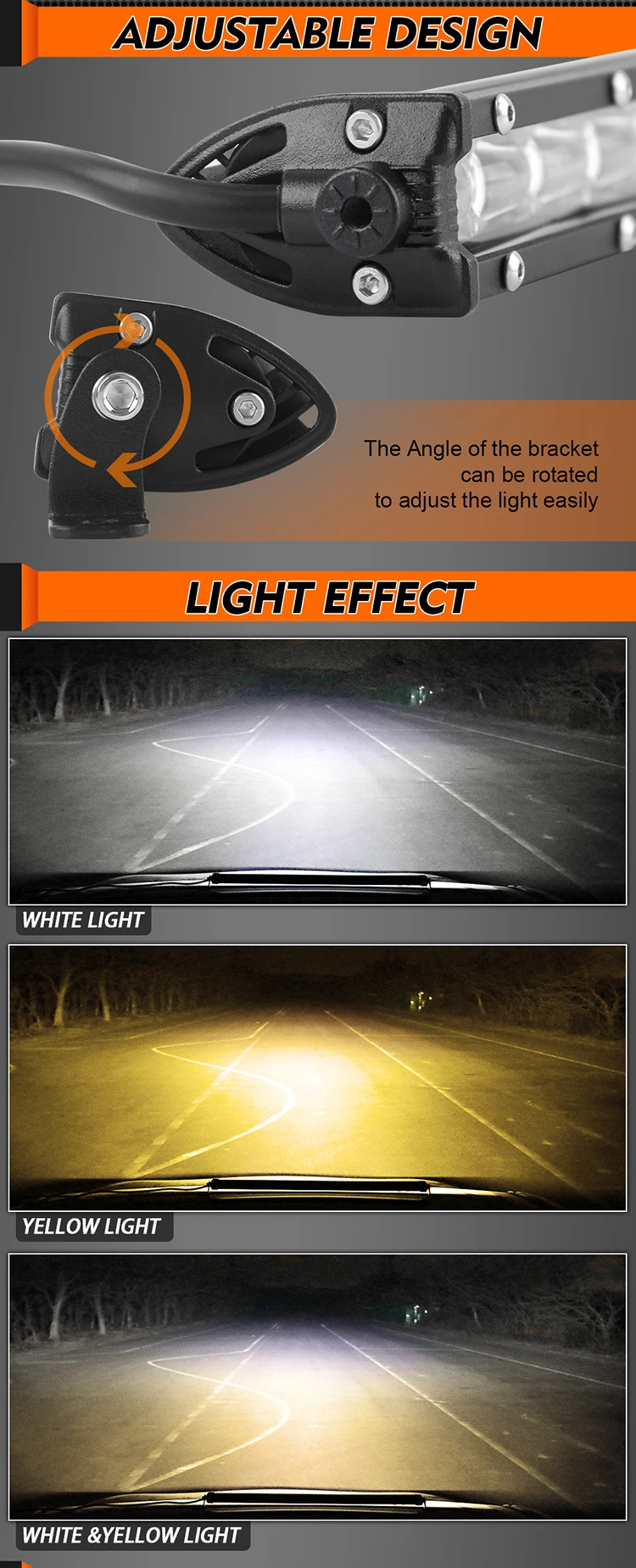 FEATURES: - Die-cast Aluminum Alloy Housing;Upgrade PC lens surface with high light transmission. - Super bright & wide illumination range: Advanced LED chips give out bright and white ray for clear visibility. Special designed lamp cup leads to wider illumination range, allowing you to see the left and right clearly. - Better heat dissipation: Quick cooling aluminum alloy heat sinks and high-quality heat conduction silicone gel can effectively extend the lifespan of the light bar to over 50,000 hours - High protective performance: IP68 Waterproof Rate, waterproof up to 1 meter of water for 30 minutes and effectively dustproof. The stainless mounting brackets are rustproof and anticorrosive. - Adjustable mounting bracket: With adjustable mounting bracket, the work light can adjust to about 45 degrees, which makes changing direction easier. - Widespread uses: The light bar can be compatible with 4x4, Trucks, Motorcycles, SUV, ATV, Cars, Boats, etc. Many indoor and outdoor uses: Garden Lighting, Backyard Lighting, Back-up Light, Off Road Lighting, Construction Lighting and so on.