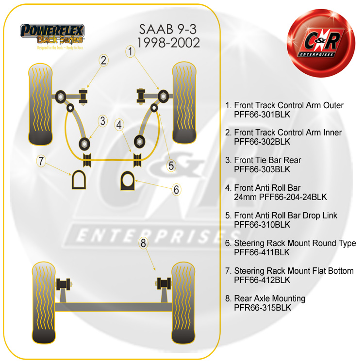 Powerflex Schwarze Serie Produkte sind nur auf Spur / Motorsport fokussiert. Für die Straße benutzen Sie die LilaAnwesend Gelb Und Rot Powerflex -Büsche eignen sich besser für Standardautos mit modifizierten und schnellen Straßen.