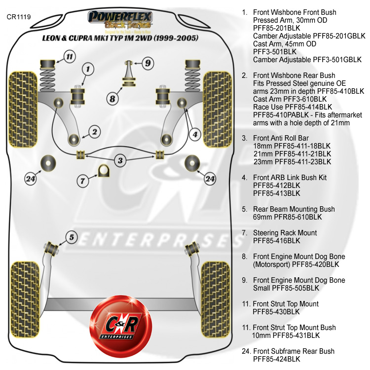Powerflex Serie negra Los productos están enfocados en Track / Motorsport. Para la carretera, use el Púrpura, Amarillo y Rojo Los arbustos PowerFlex son más adecuados para los automóviles modificados estándar y modificados por carretera rápida.