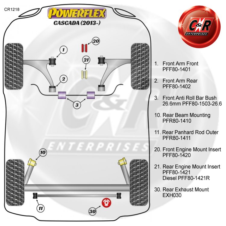 Um die richtigen Powerflex Road- oder Black Series-Buchsen zu identifizieren, die Sie benötigen, sehen Sie sich bitte das Positionsdiagramm weiter unten in der Liste an.