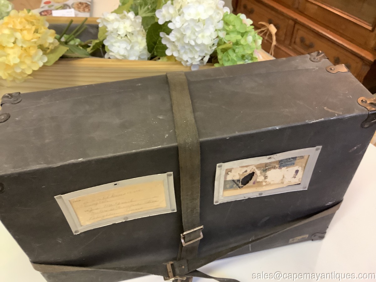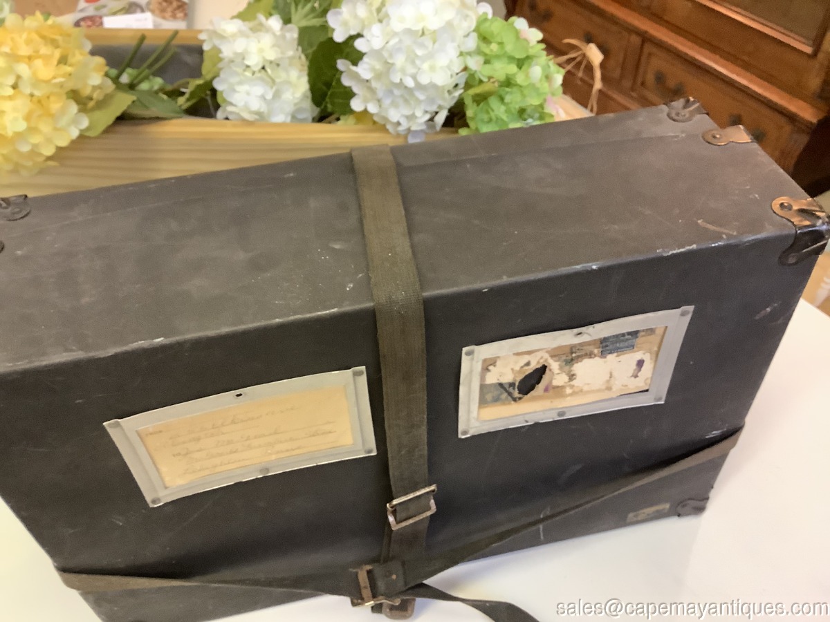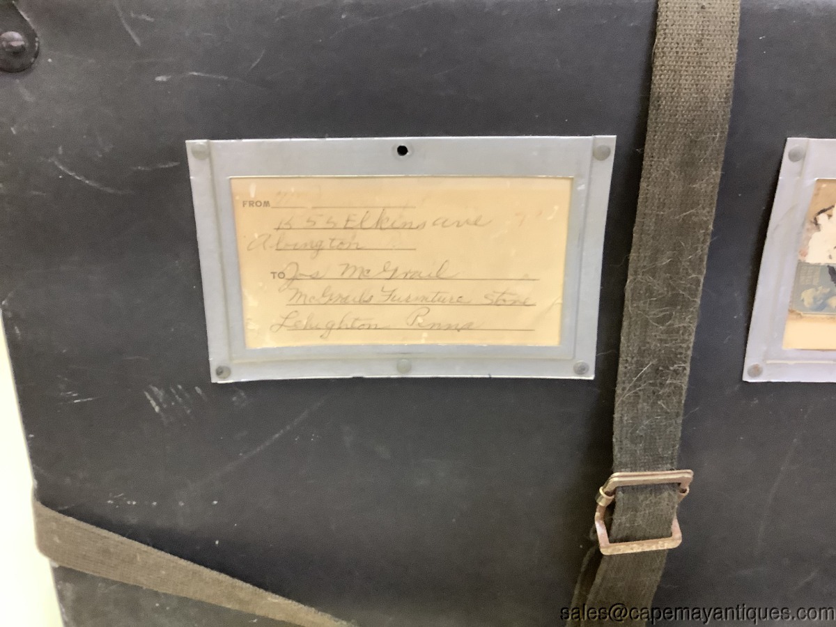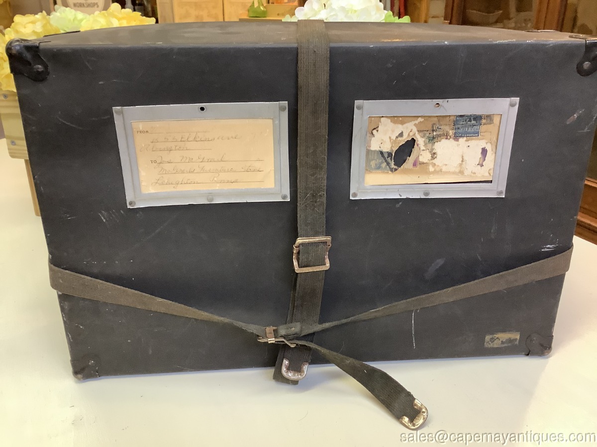 Antique Paper Postal Box Shipping Box Black w Material Straps Insert for Address. Neat old postal postage box made of thick cardboard like paper with material straps to run vertically and horizontally with pull and snap fastener. The box is 19.5" length by 16.5" by 13". Comes with original markings with a PA address. Corners are protected with a metal corner protector. Neat old box with scuffs and marks as shown.