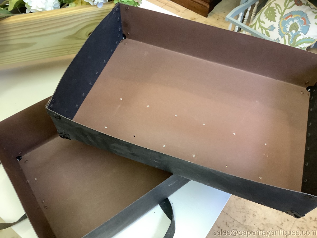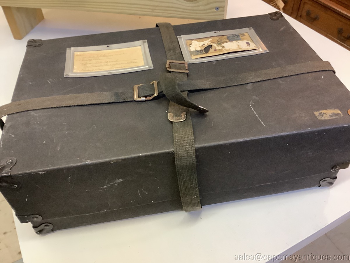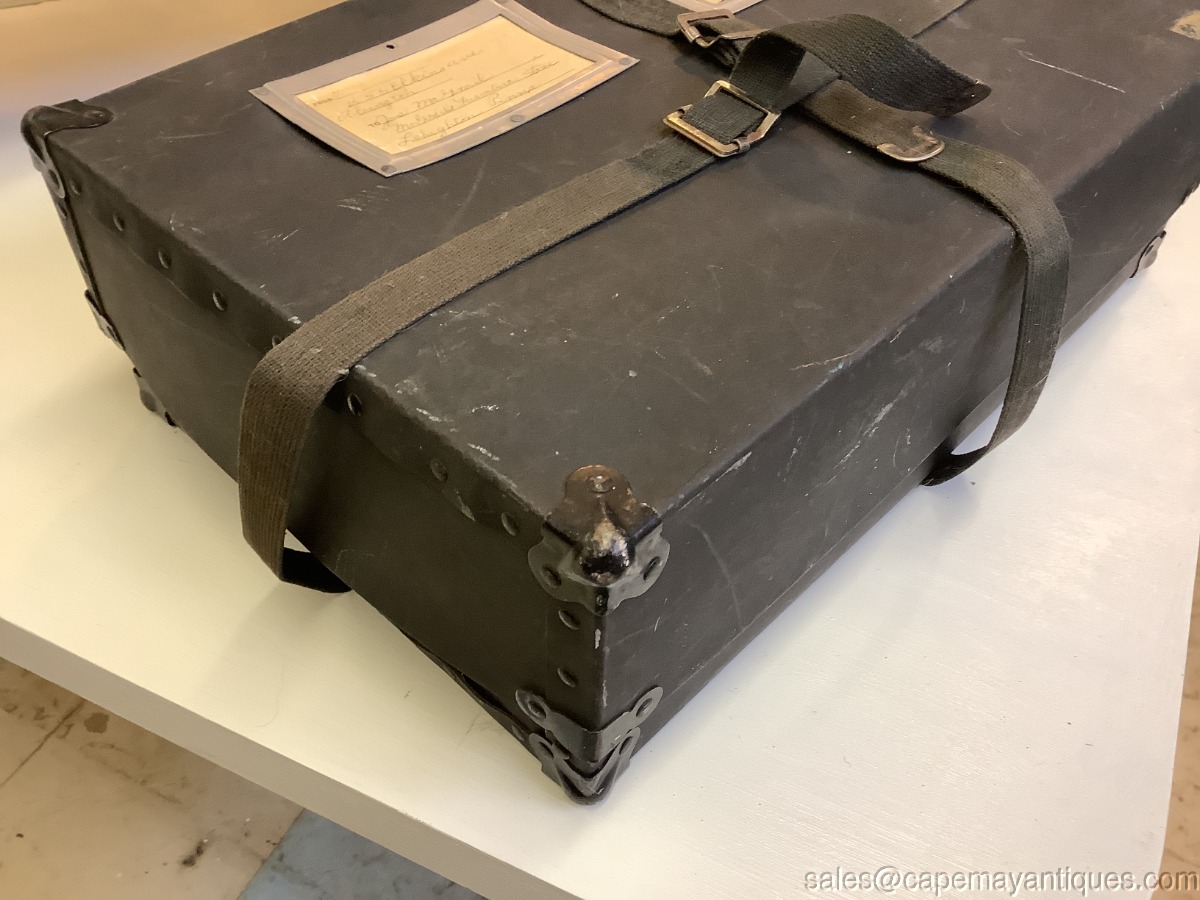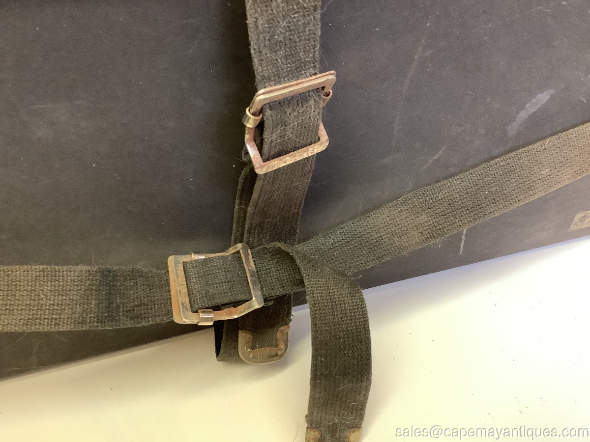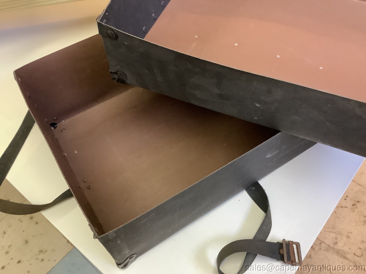 Antique Paper Postal Box Shipping Box Black w Material Straps Insert for Address. Neat old postal postage box made of thick cardboard like paper with material straps to run vertically and horizontally with pull and snap fastener. The box is 19.5" length by 16.5" by 13". Comes with original markings with a PA address. Corners are protected with a metal corner protector. Neat old box with scuffs and marks as shown.