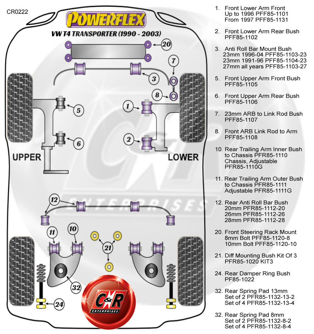Um die richtigen Powerflex Road- oder Black Series-Buchsen zu identifizieren, die Sie benötigen, sehen Sie sich bitte das Positionsdiagramm weiter unten in der Auflistung an.