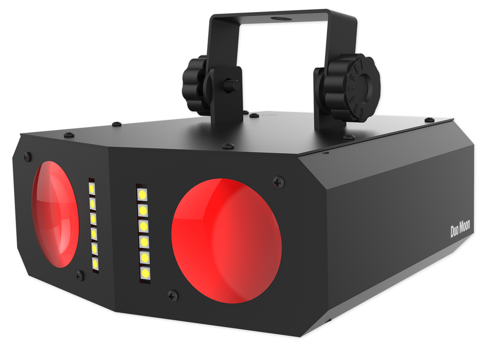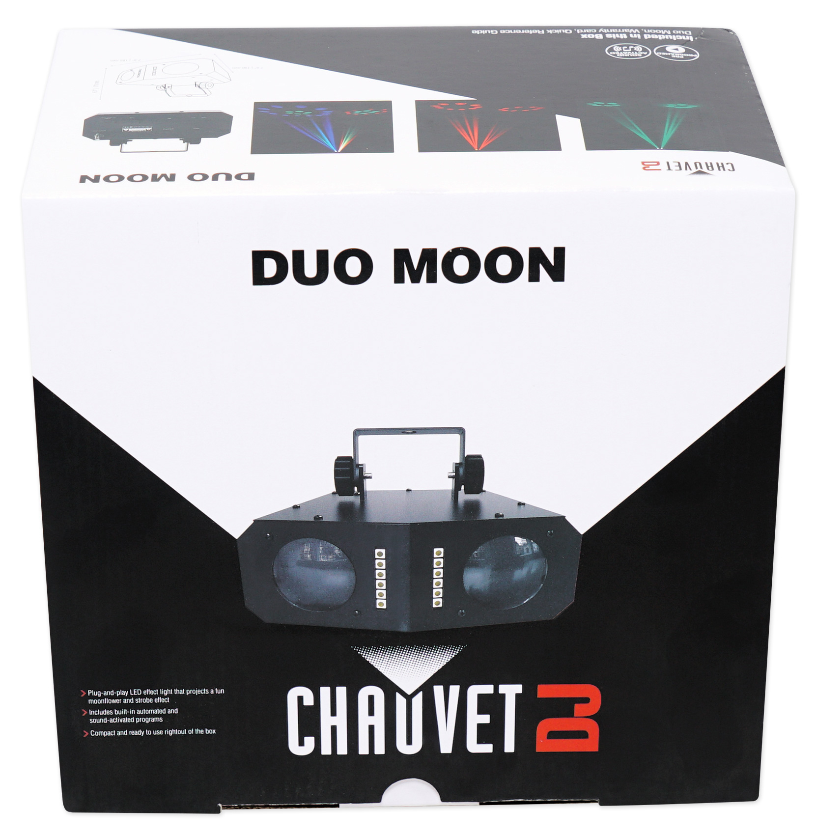 Duo Moon is a plug-and-play LED effect light that projects a fun moonflower and strobe effect. It includes built-in automated and sound-activated programs. Duo Moon is compact and ready to use right out of the box.