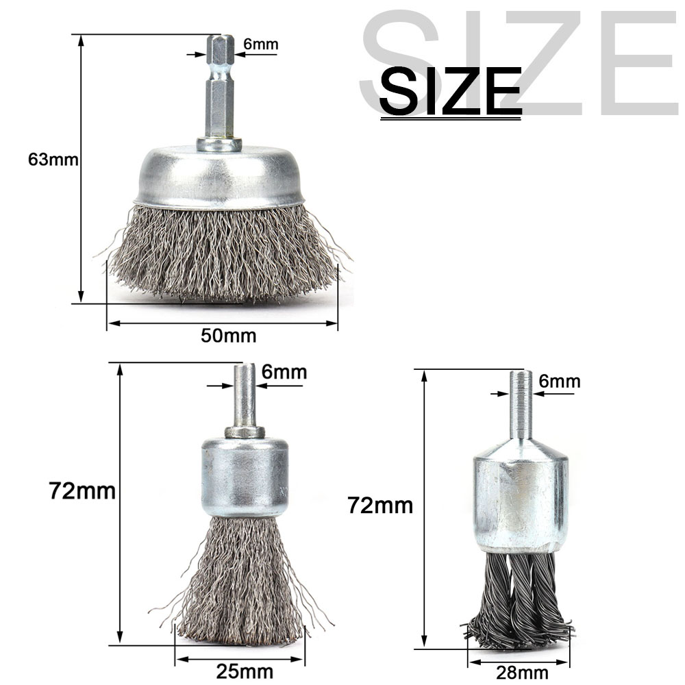 There are three different sizes and different types of stainless steel wire brushes. The handles are all 1/4 inch and the working speed is 4500RPM.