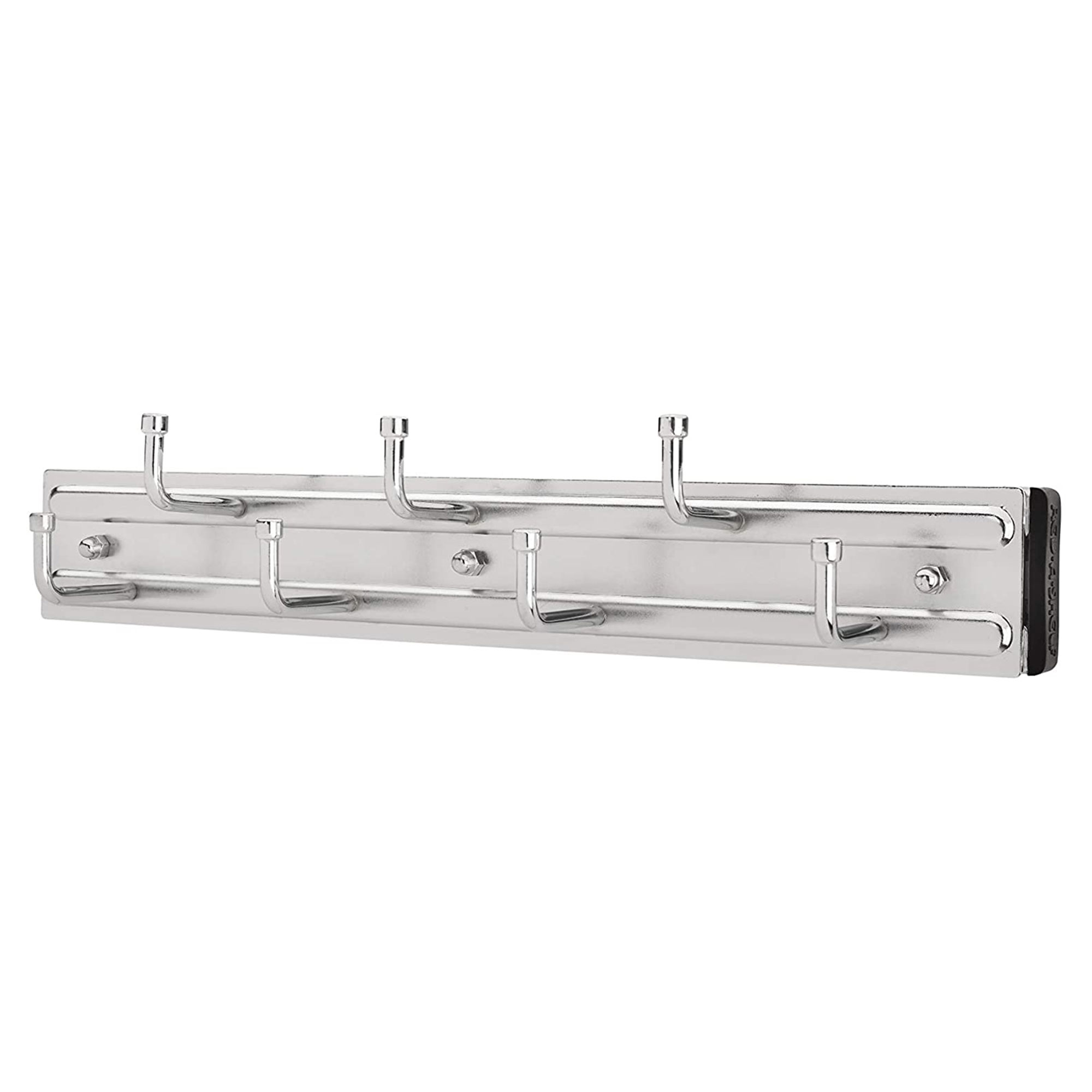 Crafted from heavy-gauge powder-coated metal wire, this belt rack combines durability with style, while simple three-screw installation makes installation quick and hassle-free. This side-mounted organizational unit installs in about 10 minutes to bring order to any bedroom, mudroom, or hallway closet. Its hooks are just the right size to hold belts, scarves, camisoles, or most other accessories with straps. The full-extension ball-bearing slide glides out to provide you with greater accessibility while maximizing the capacity of your closet. With a sturdy design and smooth operation, this unit makes it easy to reorganize, helping you find items more easily while creating a cleaner-looking space. Plus, the beautiful chrome finish looks great with any decor style.