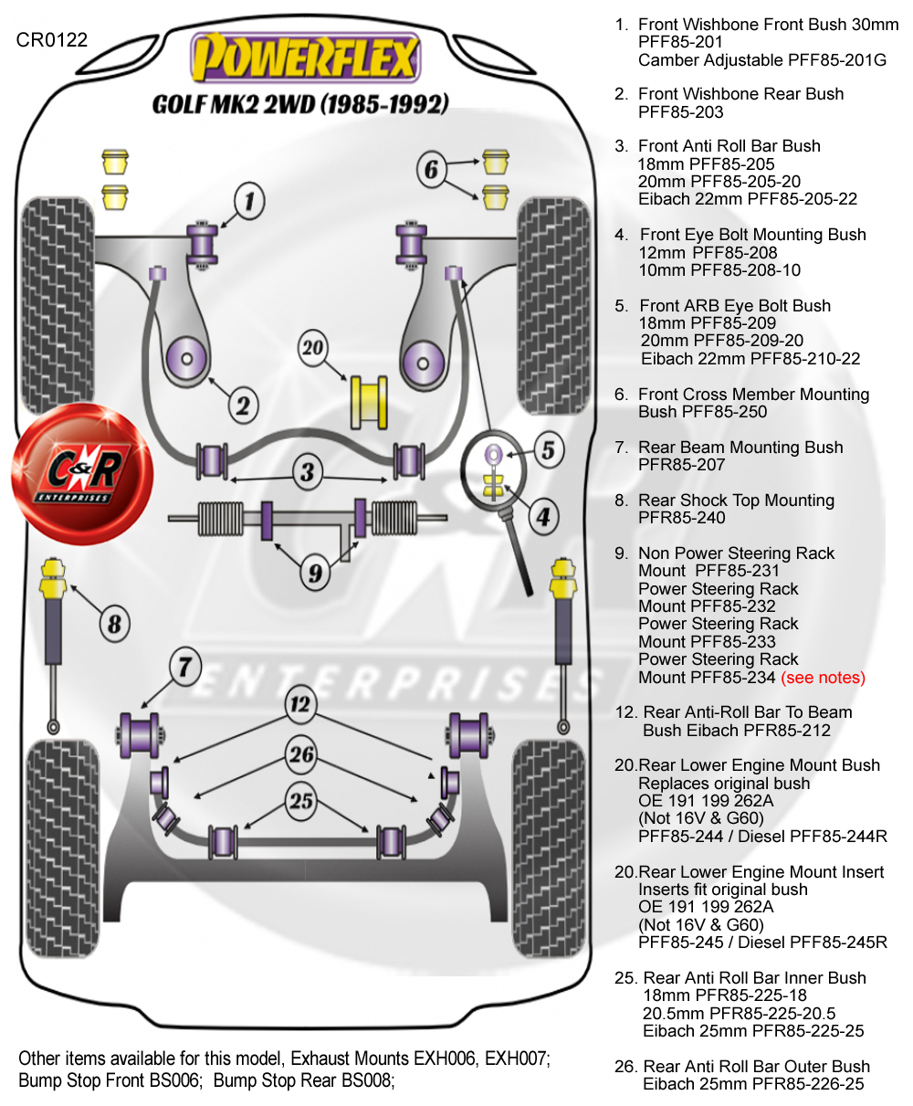 Um die richtigen Powerflex Road- oder Black Series-Buchsen zu identifizieren, die Sie benötigen, sehen Sie sich bitte das Positionsdiagramm weiter unten in der Auflistung an.