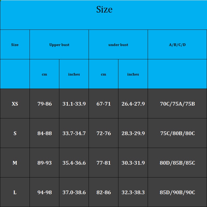 XS: upper bust: 79-86 cm/31.1-33.9 in; under bust: 67-71 cm/26.4-27.9 in; 70C/75A/75B