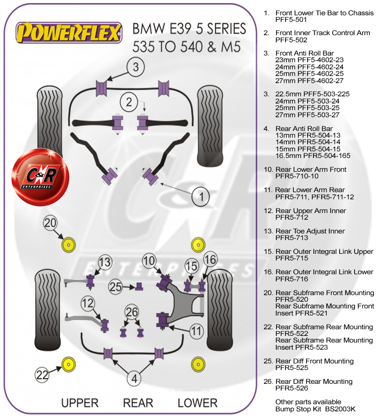 Um die richtigen Powerflex Road- oder Black Series-Buchsen zu identifizieren, die Sie benötigen, sehen Sie sich bitte das Positionsdiagramm weiter unten in der Liste an.