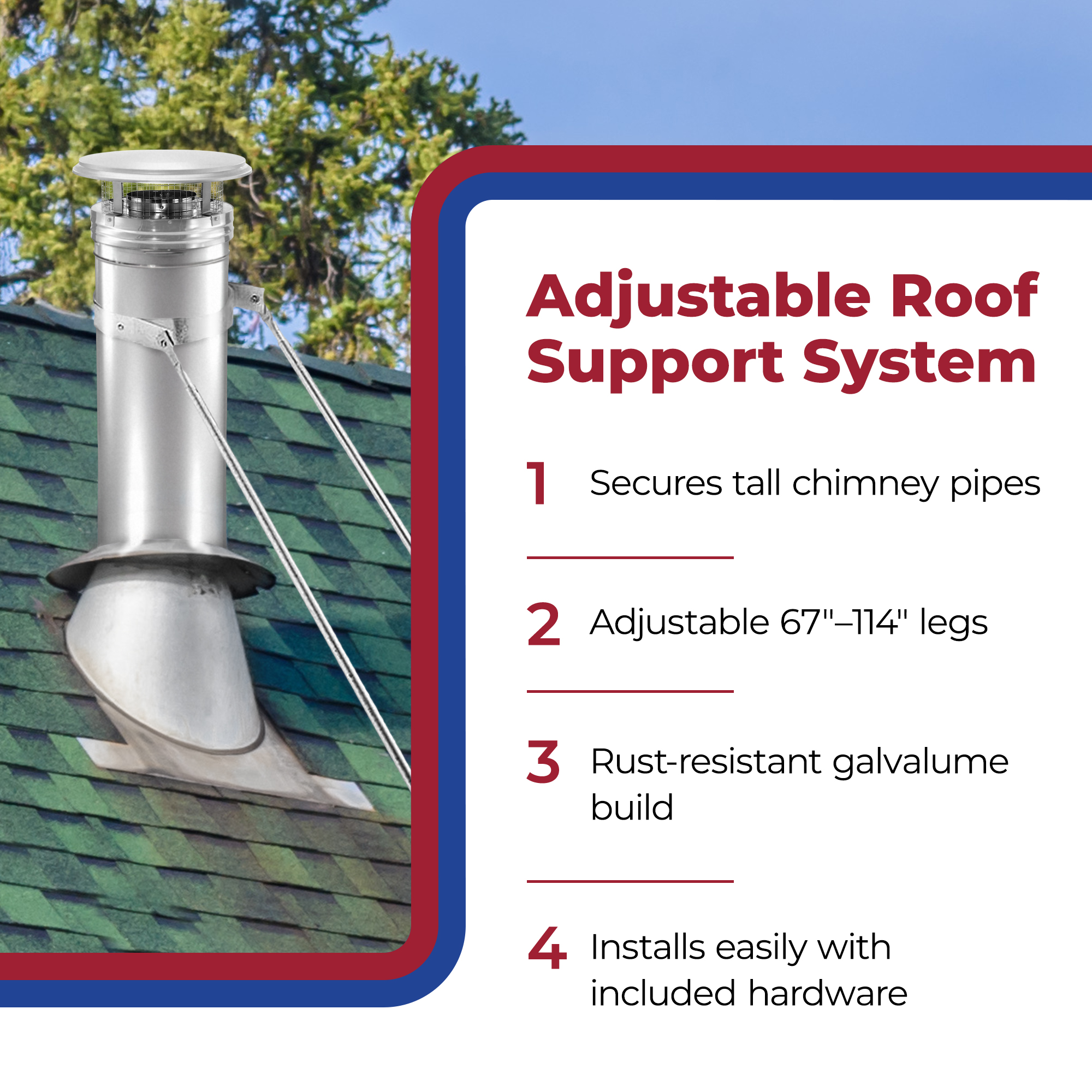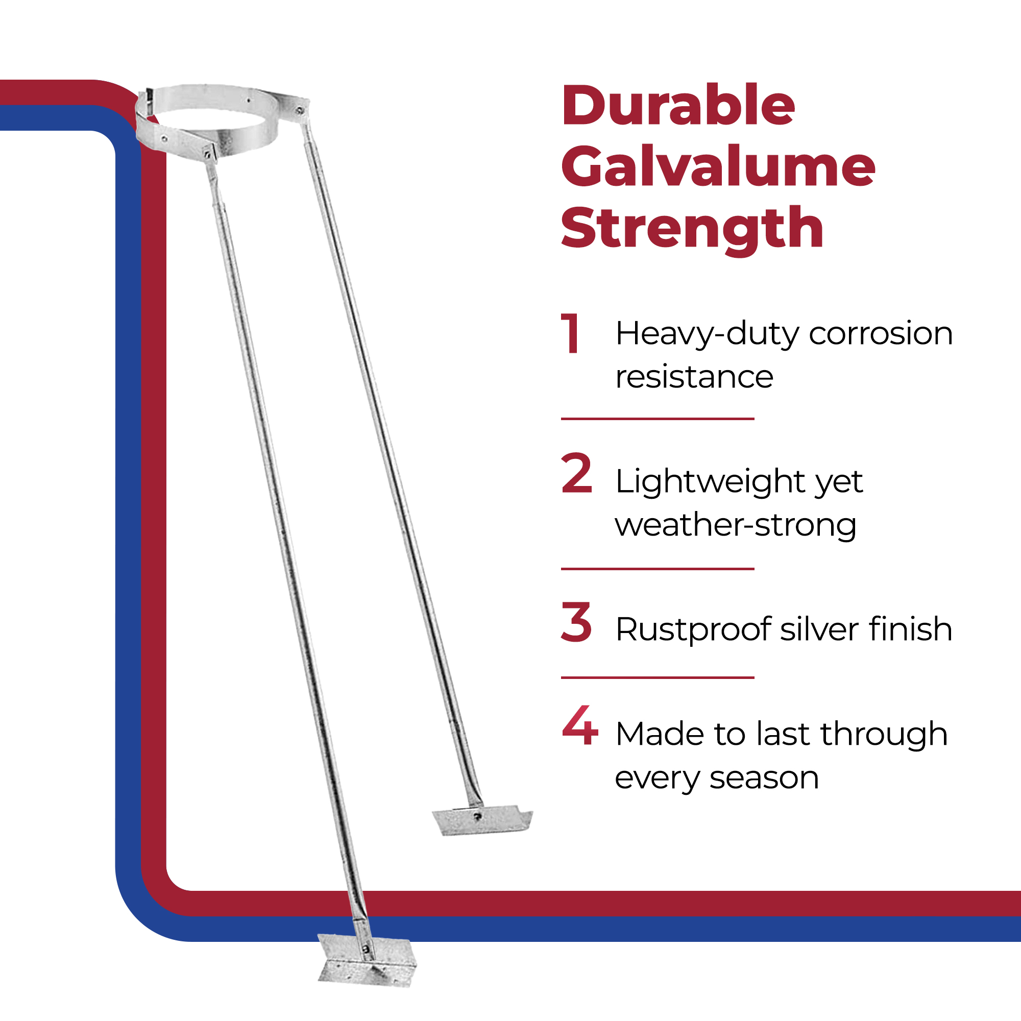 Constructed from highly durable galvalume, this roof brace connects your chimney securely to your roof when the pipe extends more than 4 feet above your roofline. Designed to withstand severe weather conditions, the durable construction is lightweight, energy-efficient, and resistant to corrosion, so you don't have to worry about climbing on top of your house to replace this bracket routinely.