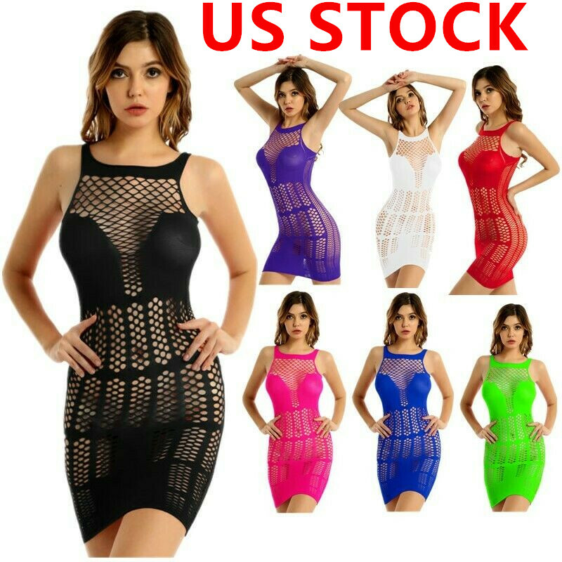 Women’s one-piece erotic hollow out fishnet bodystockings lingerie mini dress, one size fits most.