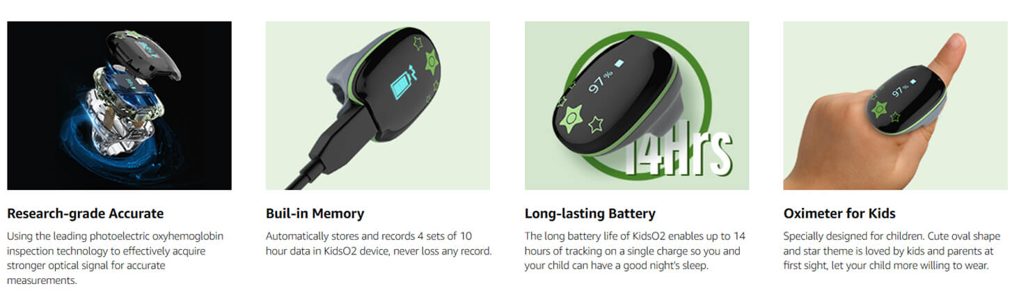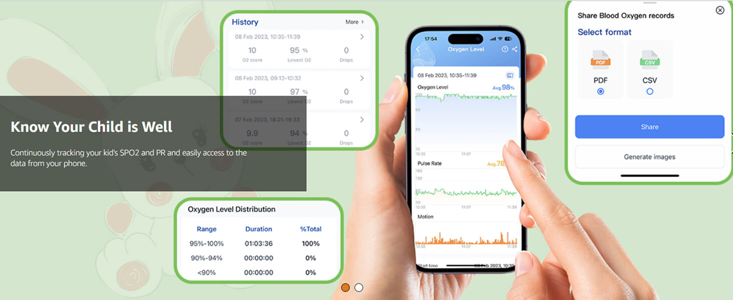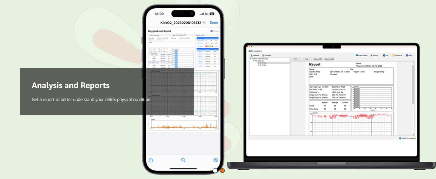 - 【All-day Monitoring】Put on and start. Continuously Tracking your child's SPO2, PR, PI and body movement and output detailed analysis reports to give you a better understanding of your child's body status.