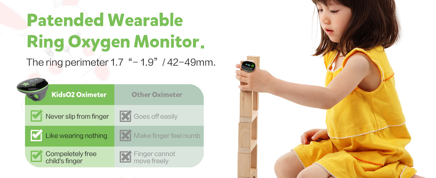 - 【Designed for Kids】Patented soft O2 ring sensor designed specifically for 3-10 year-old children is more convenient and won't fall off. Fits finger perimeter 1.7“- 1.9”/ 42-49mm. Oval shape with adorable star theme let the kids fall in love with it.