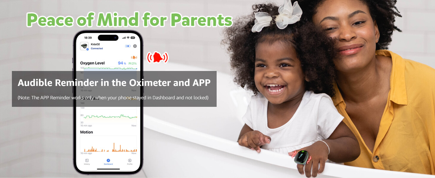 - 【Buzzer Warning】KidsO2 device and APP beep to remind you when your kids'oxygen level fall below the pre-set value. The threshold and volume can be adjusted freely in the APP.(Note: The APP reminder works only when your phone stayed in dashboard and not locked)