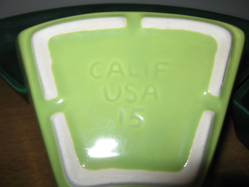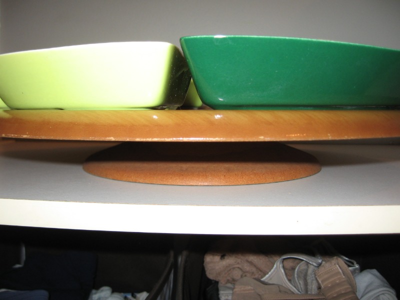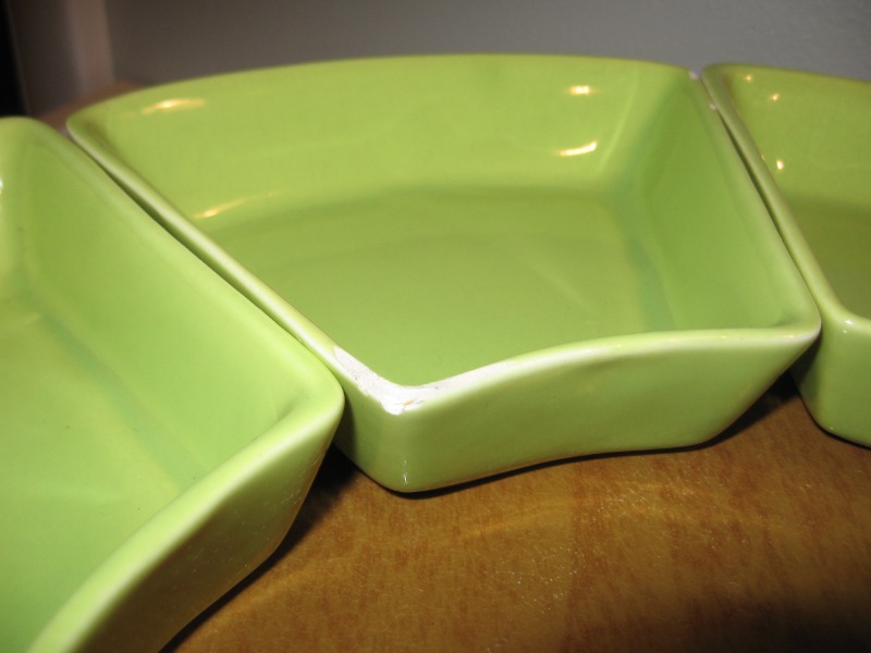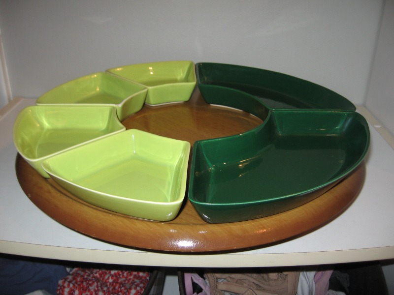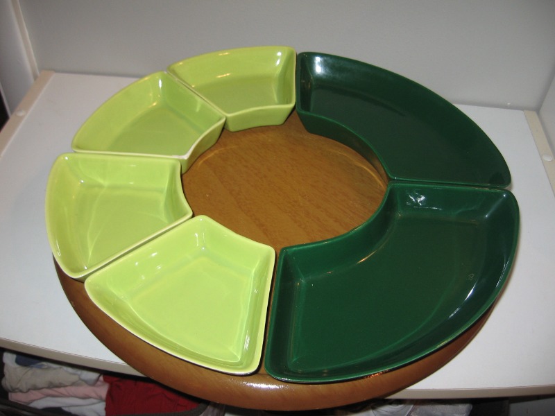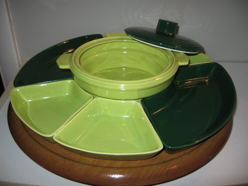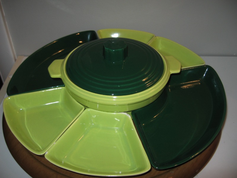 6 Sections And Covered Casserole of Dark & Lime Green Pottery on Wooden Turn Table