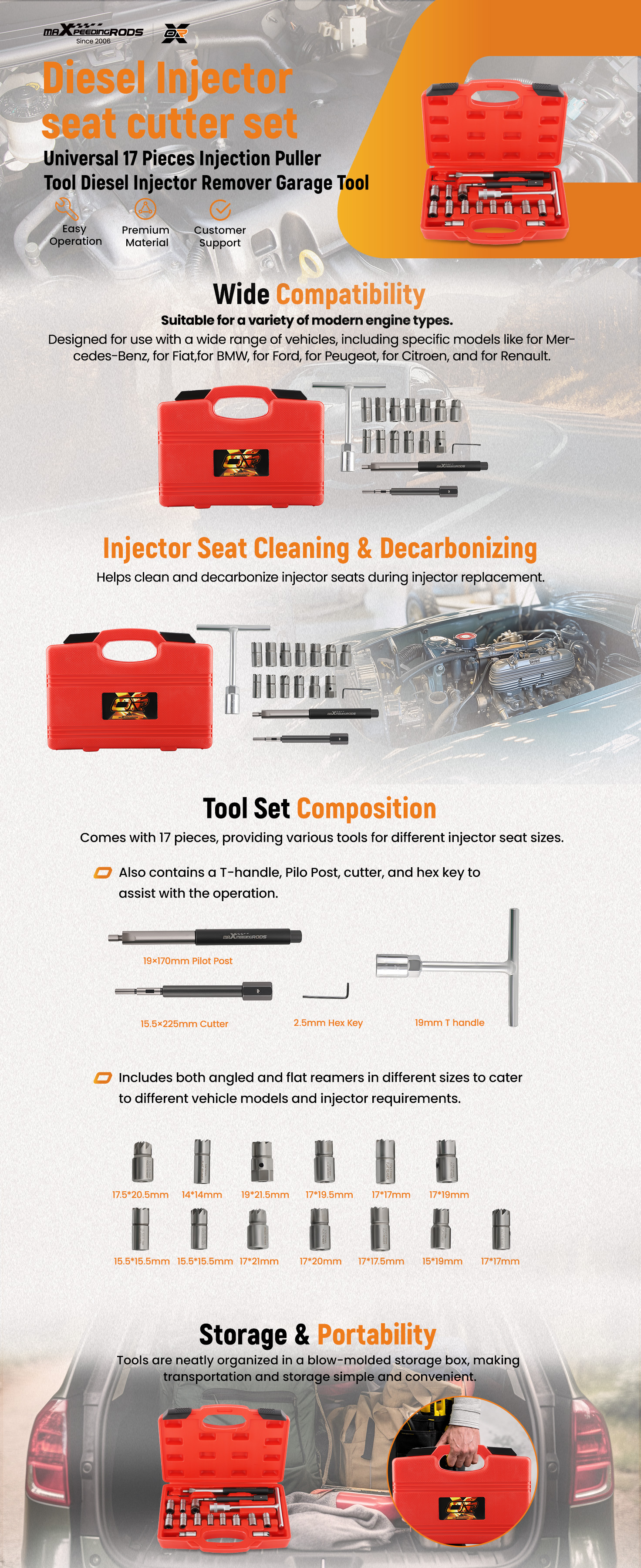 6.Dieser Injektorsitz-Schneidsatz ist für eine Vielzahl von Fahrzeugen geeignet, z. B. 17 mm Flachschneider mit 19 mm Außendurchmesser für Mercedes-Benz CRD