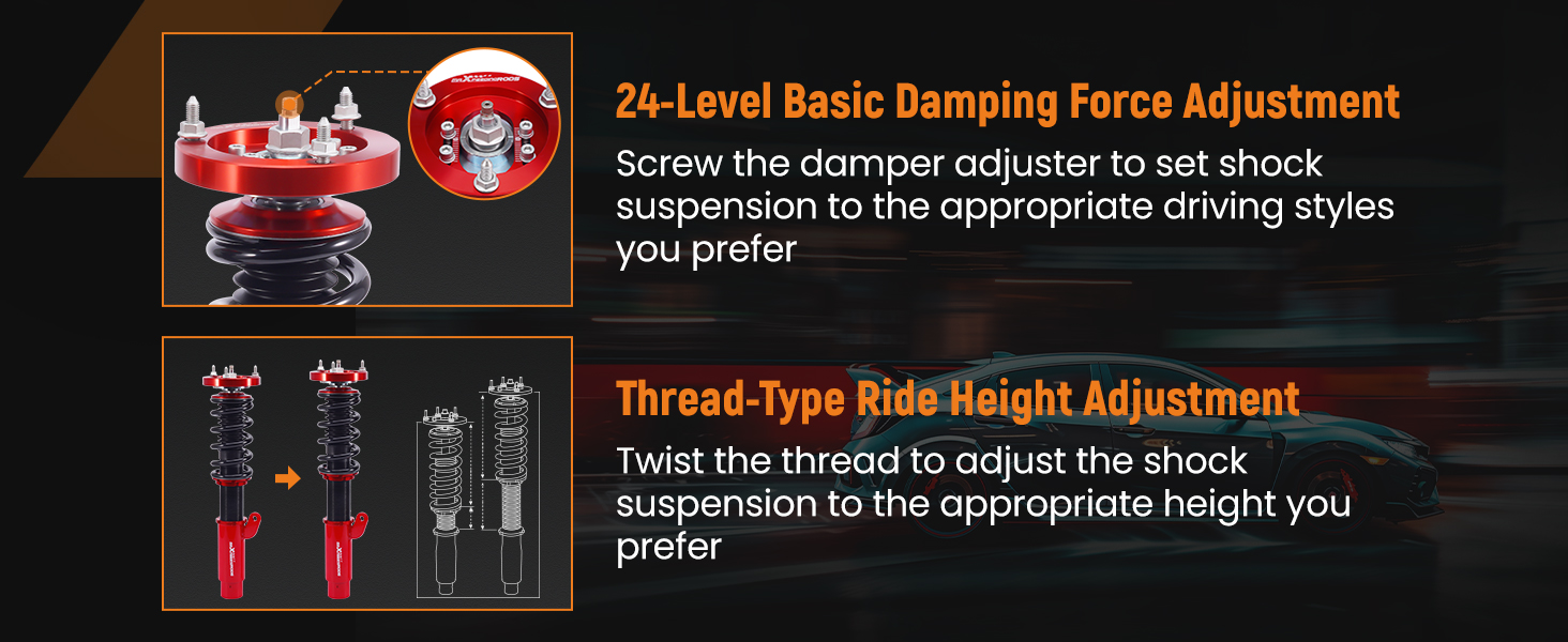 - 24 Levels Damping Force Adjustable: Provides an extensive range of adjustability, making it easy to customize for various purposes and achieve desired ride comfort.