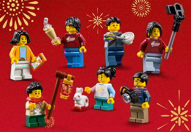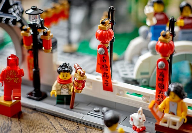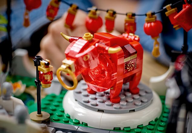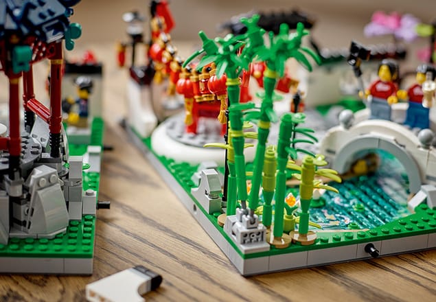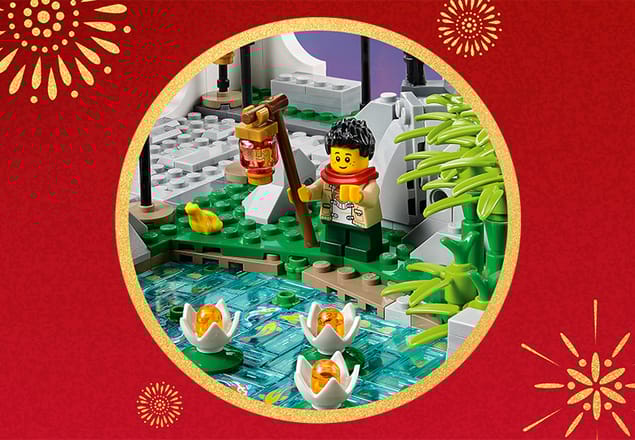 A lantern tunnel leads to a detailed, traditional pavilion.