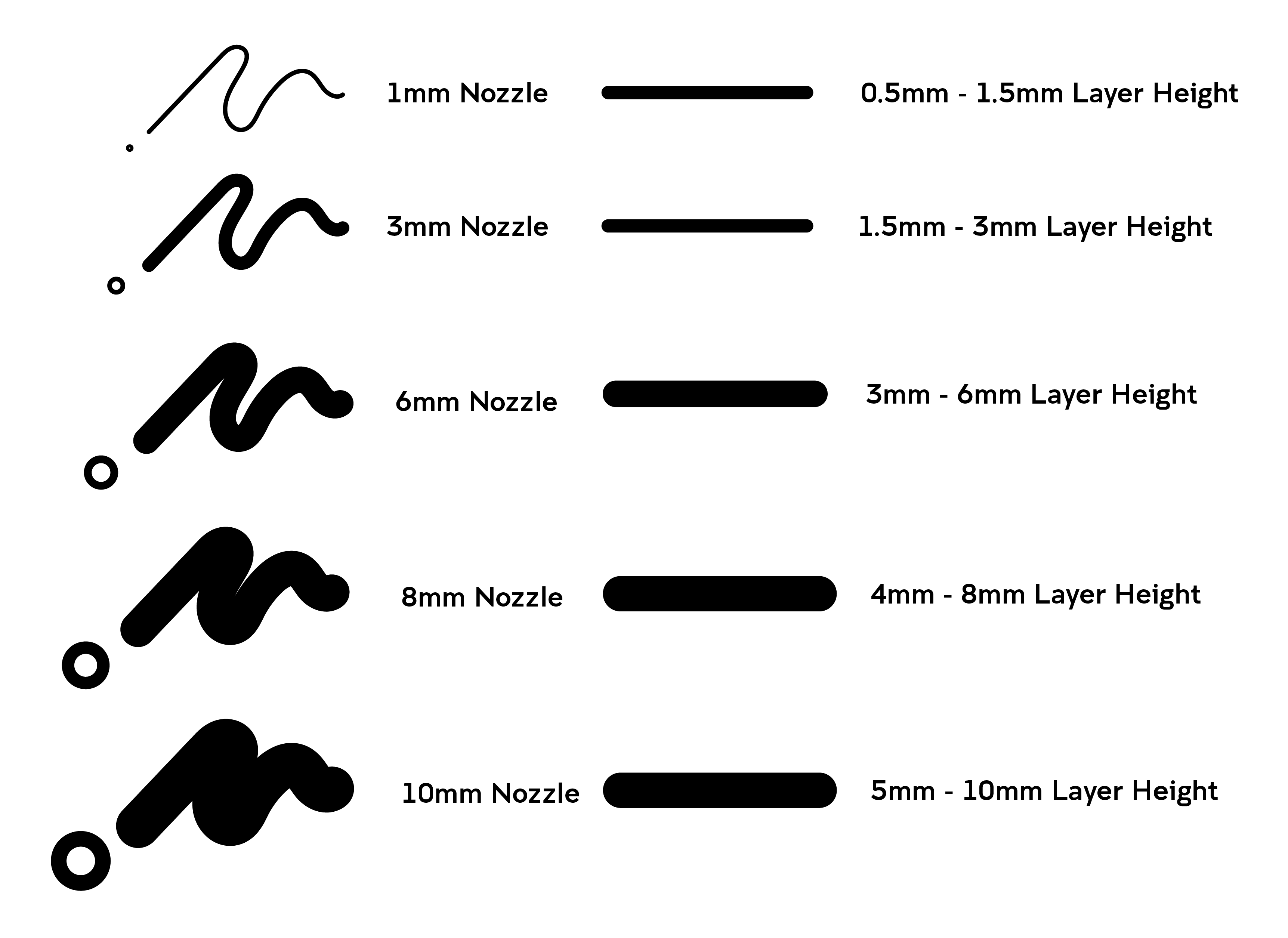 Layer Heights Before getting started designing or slicing your file you will need to take the size of the nozzle and the corresponding layer height into account. If your layers are too high in relation to the size of your nozzle the clay won’t join together. Whilst layers that are too small run the risk of over-extrusion, pushing too much clay on top of each other, which can cause clogging or ruin prints. Below you will find a guide for recommended layer heights based on the nozzle sizes we have at the DFL.