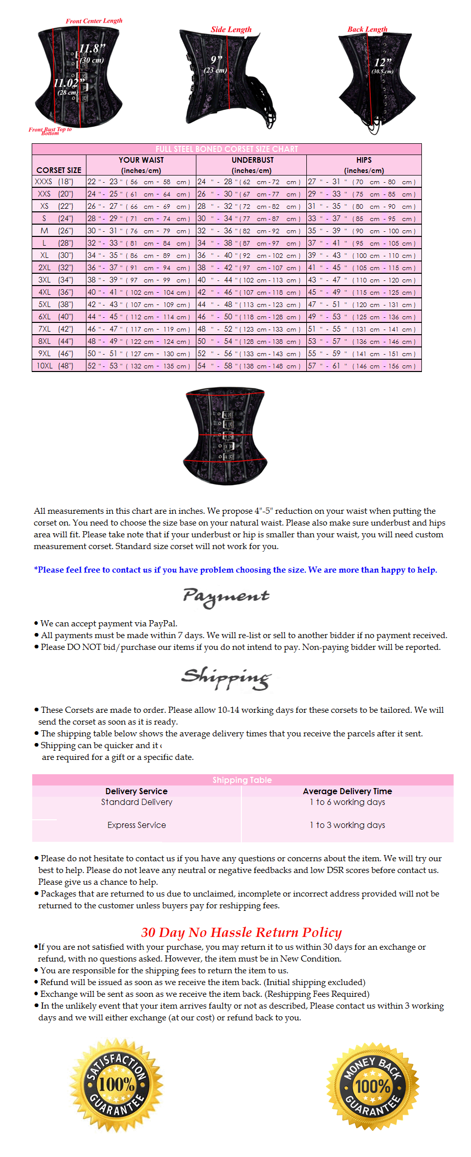 The Corset can draw in your waist and flatten your tummy We aim to reduce waist by up to 5" inches and have Perfect Hourglass Figure effect The Corset can be used for Tight Lacing, Shaping and Waist Training -Total of 24 Steel Bones -4 Rigid Steel Plates -20 Spiral/Flexible Steel Bones around the corset -Fasten at the side with Rust Free YKK Zip -Ties up at the back with Strong Laces/Ribbon at waist level -5 Front Buckles add the beauty of the corset -100% Cotton Twill Lining with waist tape -11.8" (30 CM) length for the front (measure from centre) -11" (28 CM) length for the front (measure from overbust) -9" (23 CM) length for the side -12" (30.5 CM) length for the back -5" (12.7 CM) length for modesty panel at the back |