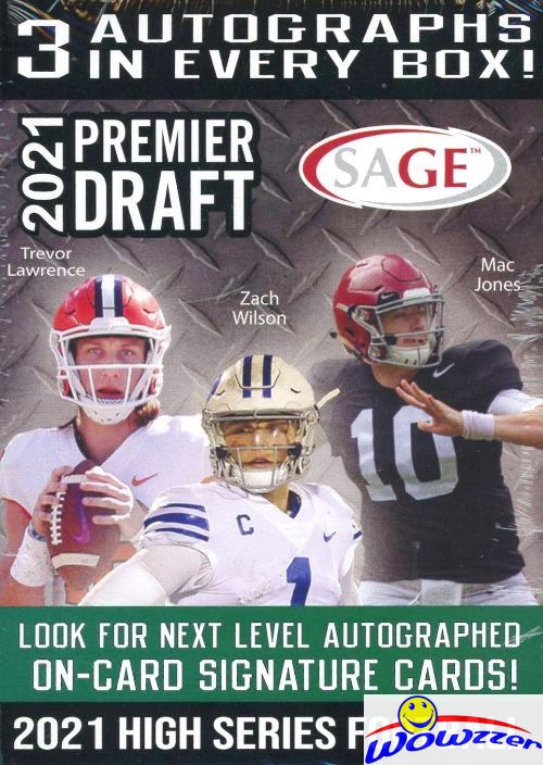 Wowzzer! Brand NEW! We are Proud to offer this 2021 Sage Hit Football High Series Factory Sealed CASE! This Factory Sealed CASE includes (40) EXCLUSIVE Factory Sealed Blaster Boxes!  Each Awesome EXCLUSIVE Factory Sealed Box includes 63 Cards including THREE(3) AUTOGRAPH Cards & TEN(10) EXCLUSIVE RETAIL PARALLELS! **Total of (120) AUTOS & (400) Parallels in this 40 Box Factory Sealed CASE!!** Look for Rookies & Rookie Autographs of Top NFL Draft Picks Trevor Lawrence, Justin Fields, Zach Wilson, Devonta Smith, Trey Lance & Many More! Find Peak Performance Liquid foil cards w/auto versions! Look for Gold level Autographed cards numbered to 100, 1/1 Blue level base autographs and Peak Performance including numbered autograph parallels!  Look for on-card NEXT LEVEL SIGNATURES & PARALLELS and Art Gallery Subset with 1/1 original art sketch cards of top players! This Product is Loaded! Good Luck with Pulls! Thanks