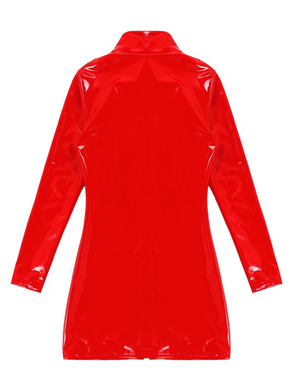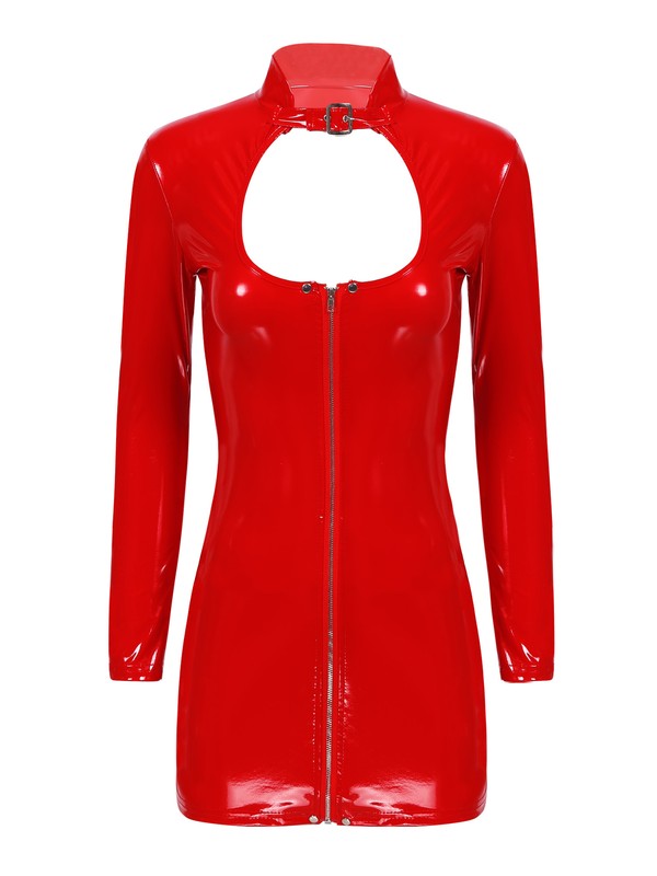 Damen Wet Look Lackleder Keyhole Bodycon Kleid Langarm Reißverschluss Minikleider.