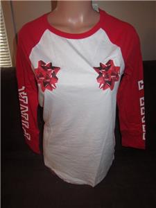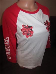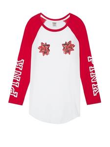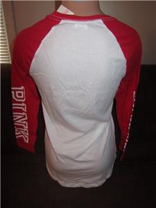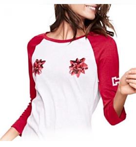Brand New, Victoria's Secret Pink size xsmall. Holiday present bow baseball Style campus tee. 3/4 sleeve s. The color is white and red it has pink written down the arms on both arms and 2 red bows on the chest.