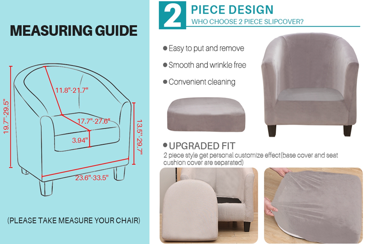 Perfect Size: Solve your size troubles. We upgarde 3-piece splicing process at the backrest design. Easy to put on and off. Chair height: 65-72cm /25.6"-28.3". Chair Width: 65-75cm /25.6"-29.5". Seat width: 65-75cm /25.6"-29.5". Cushion width:45-52cm / 17.7"-20.5", which suitable for most armchairs/barrel chair/club chair/tub chair.(NOTICE: PlS measure your armchair slipcovers before buying to make sure it fits).