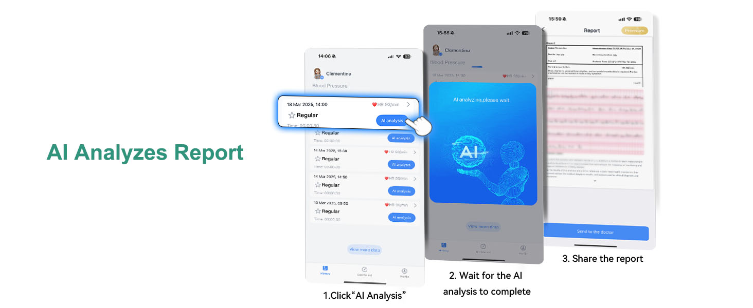 - ☀️Smart Analysis Report: The AI-ECG tracker for heart health creates your ECG and performs AI analysis with reports - Recognise regular rhythms and 17 irregular conditions for reference. An easy-to-read report helps you better understand your condition. You can also share the report with others with a single click