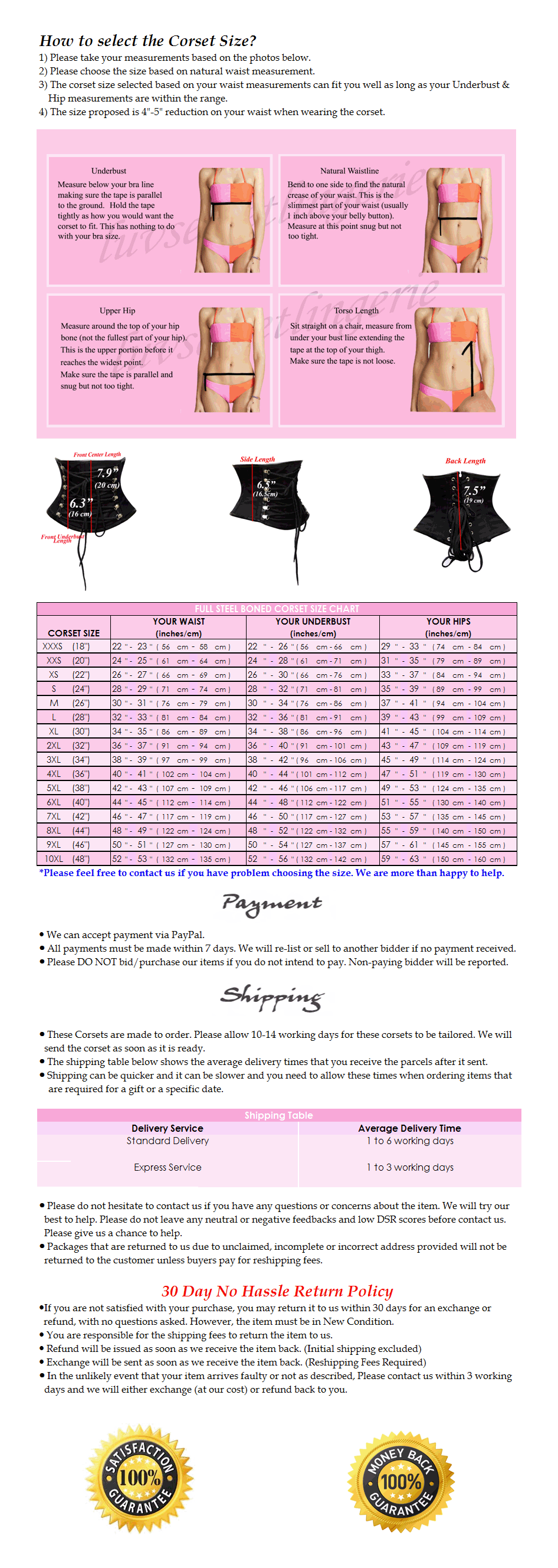 The Corset can draw in your waist and flatten your tummy We aim to reduce waist by up to 5" inches and have Perfect Hourglass Figure effect The Corset can be used for Tight Lacing, Shaping and Waist Training -Total of 18 Steel Bones -4 Rigid Steel Plates -14 Spiral/Flexible Steel Bones around the corset -Ties up at the back with Strong Laces/Ribbon at waist level -100% Cotton Twill Lining with waist tape -7.9" (20 CM) length for the front (measure from centre) -6.3" (16 CM) length for the front (measure from underbust) -6.5" (16.5 CM) length for the side -7.5" (19 CM) length for the back -5" (12.7 CM) length for modesty panel at the back |