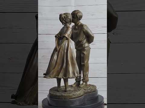 Oh, the innocence of childhood crushes! This charming sculpture captures a tender moment as a young boy and girl prepare to share their very first kissmdash;one they will remember for a lifetime. The boy, hiding a freshly picked bouquet of flowers behind his back, gazes sweetly into his friend’s eyes. The girl, dressed in a lovely little dress and wearing her hair in a high ponytail, stands shyly with her hands tucked behind her back, leaning in with anticipation.