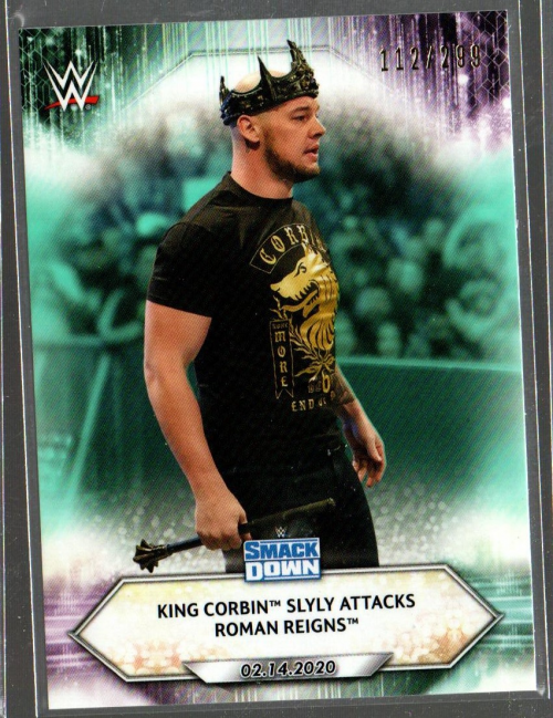 2021 Topps WWE Aqua #18 King Corbin Slyly Attacks Roman Reigns /299
