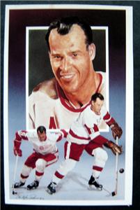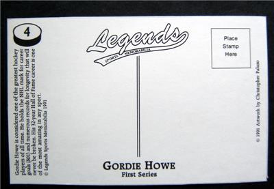 ITEM: Gordie Howe Legends NHL Hockey Color Post Card #4 1st Series. c. Legends Sports Memorabilia 1991. Christopher Paluso - Artist. Measures 3 1/2" by 5 1/2". Glossy finish. Back reads: "Gordie Howe is considered one of the greatest hockey players of all time . . . ."