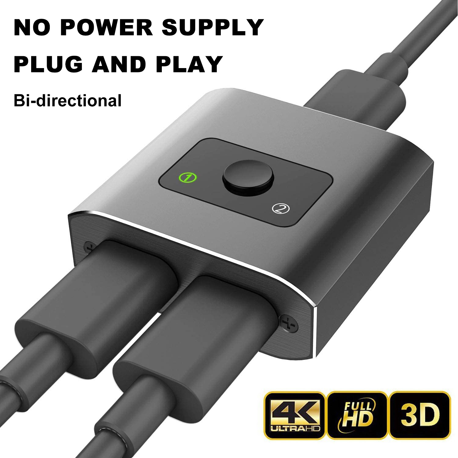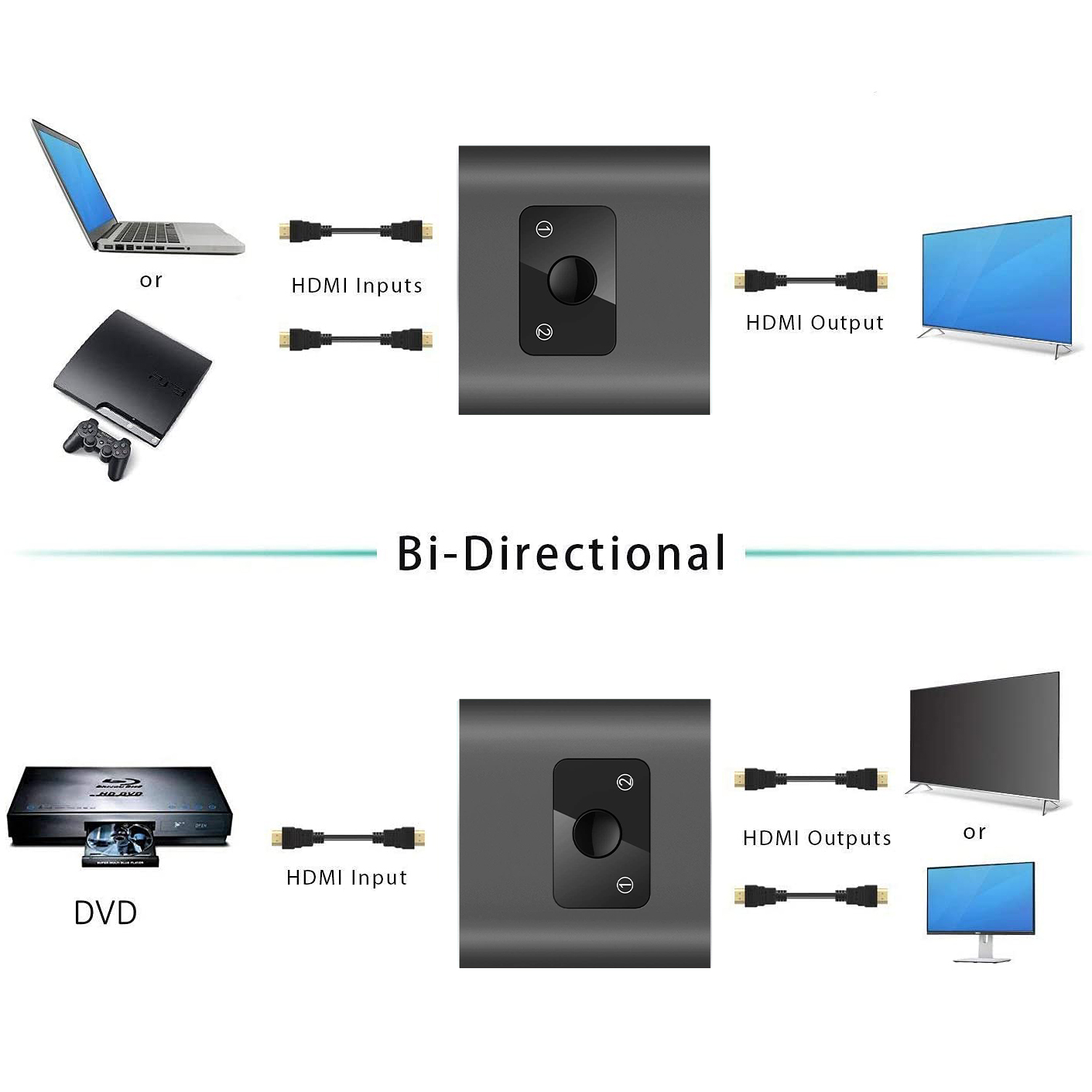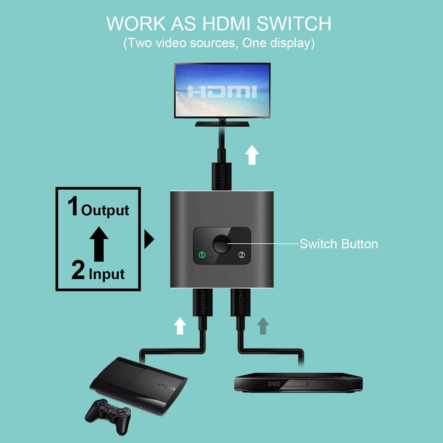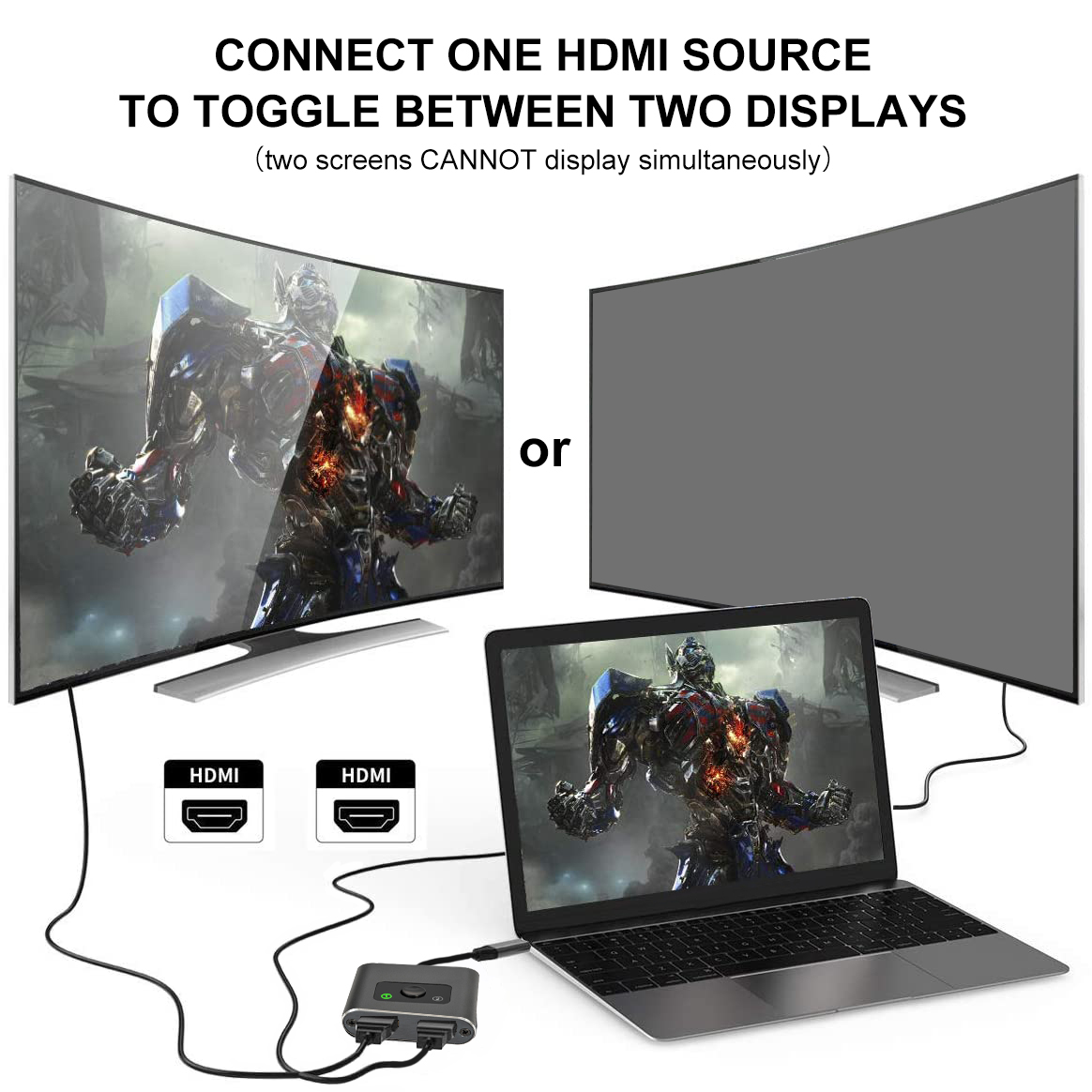 - 1x2 or 2x1 HDMI SWITCH - Modern design, HDMI bi-directional splitter help you connect two HDMI sources to one HDMI display, or connect one HDMI source to toggle between two displays (two screens CANNOT display simultaneously).