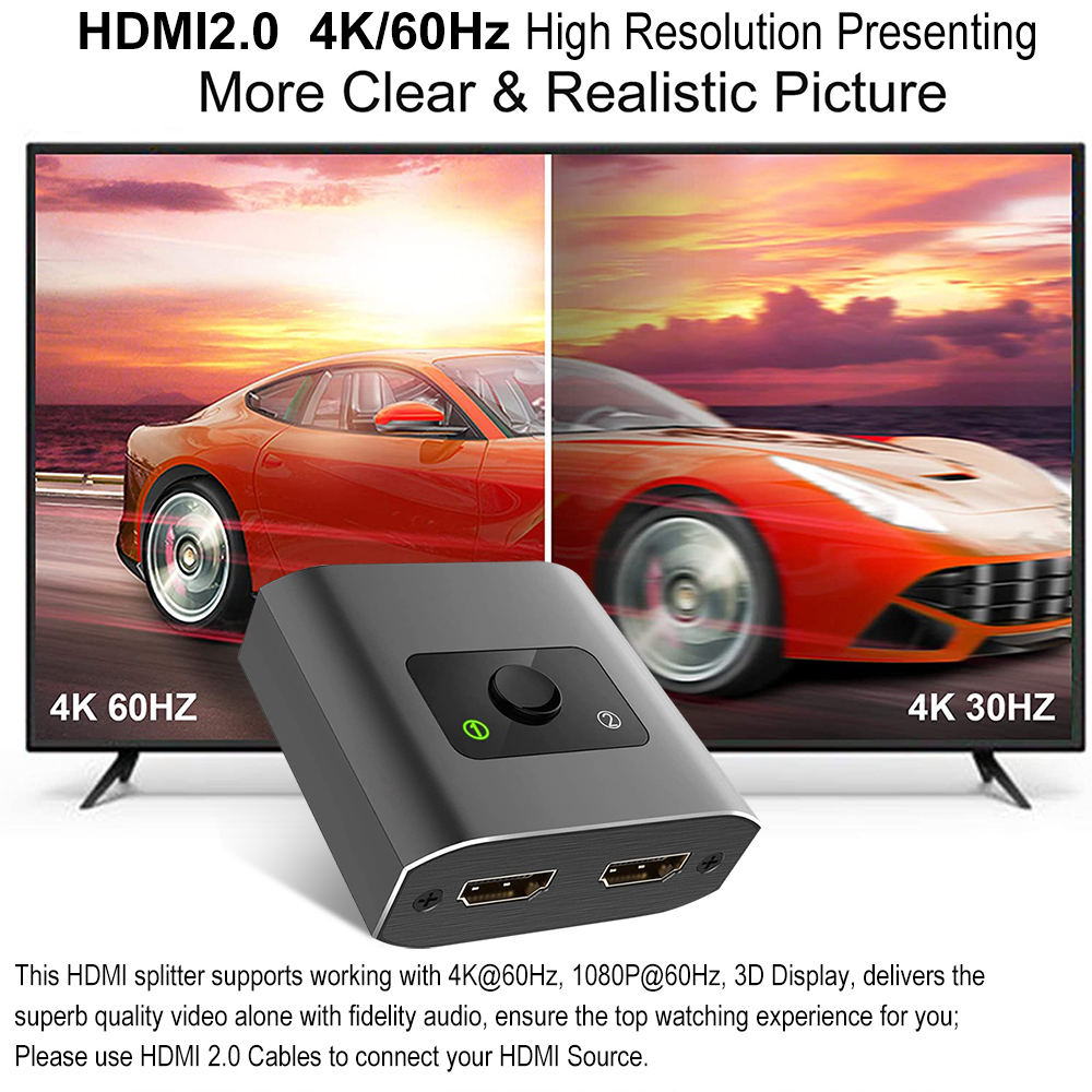 - DURABLE AND RELIABLE FULL METAL JACKET CONSTRUCTION - Metal casing design and overall shielding without signal interference.This HDMI splitter supports working with 4K@60Hz, 1080P@60Hz, 3D Display, delivers the superb quality video alone with fidelity audio, ensure the top watching experience for you; Please use HDMI 2.0 Cables to connect your HDMI Source.