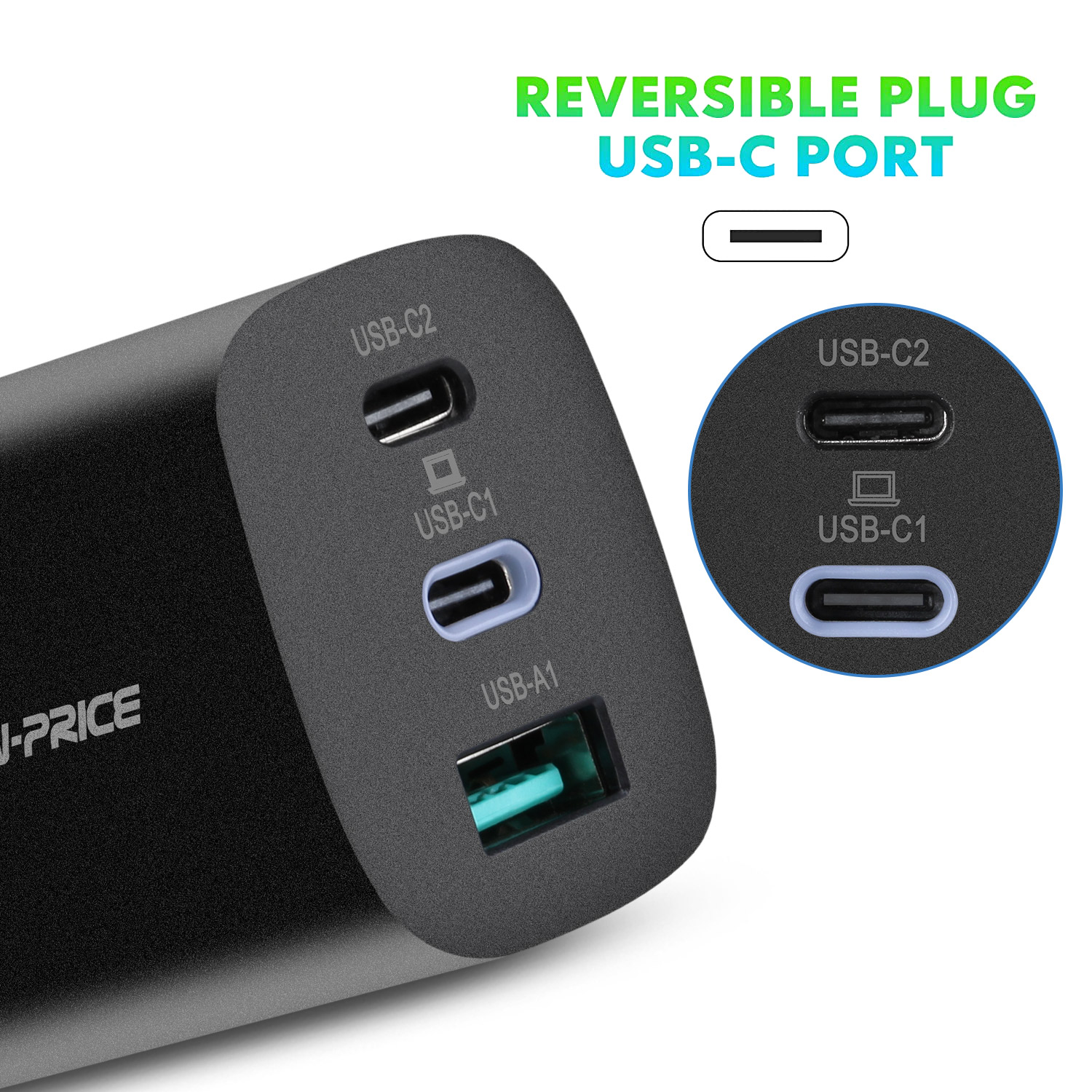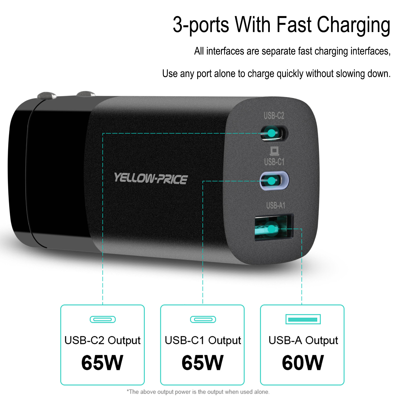 - 3-Port High-Speed Charging - One USB-C1 (65W) ,one USB-C2 (65W), one USB-A(60W) which can quickly charge your Laptop and Phone at the same time with one charger.