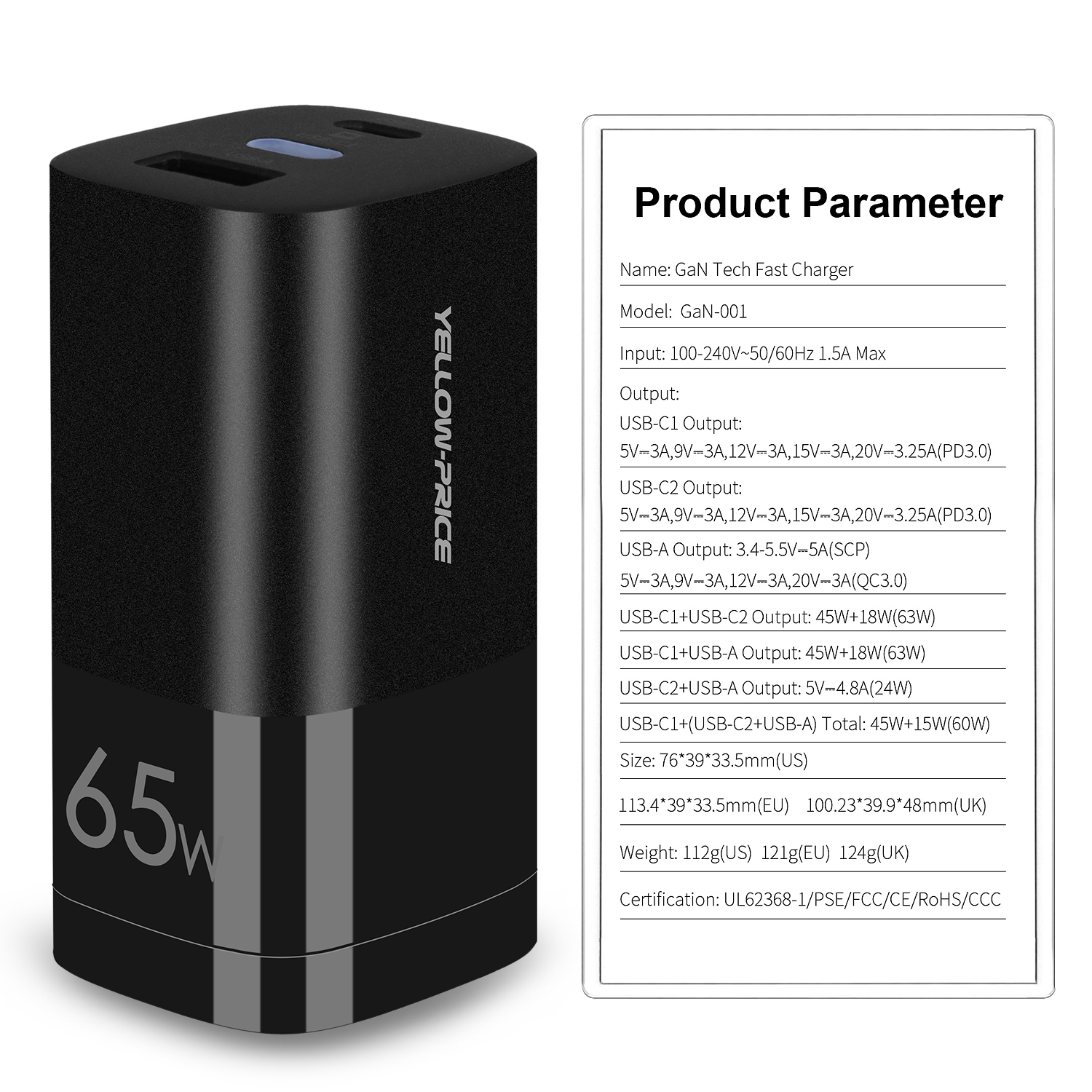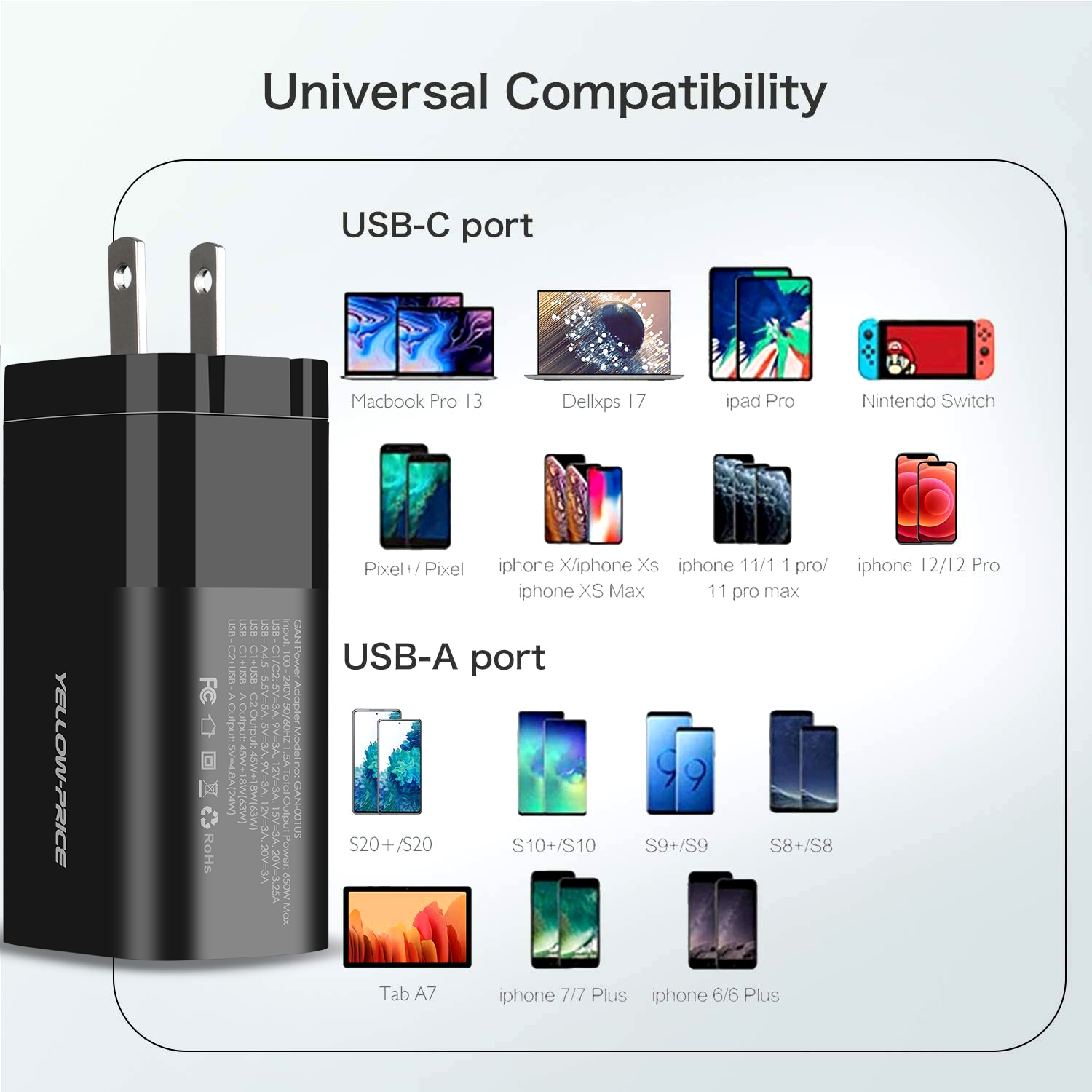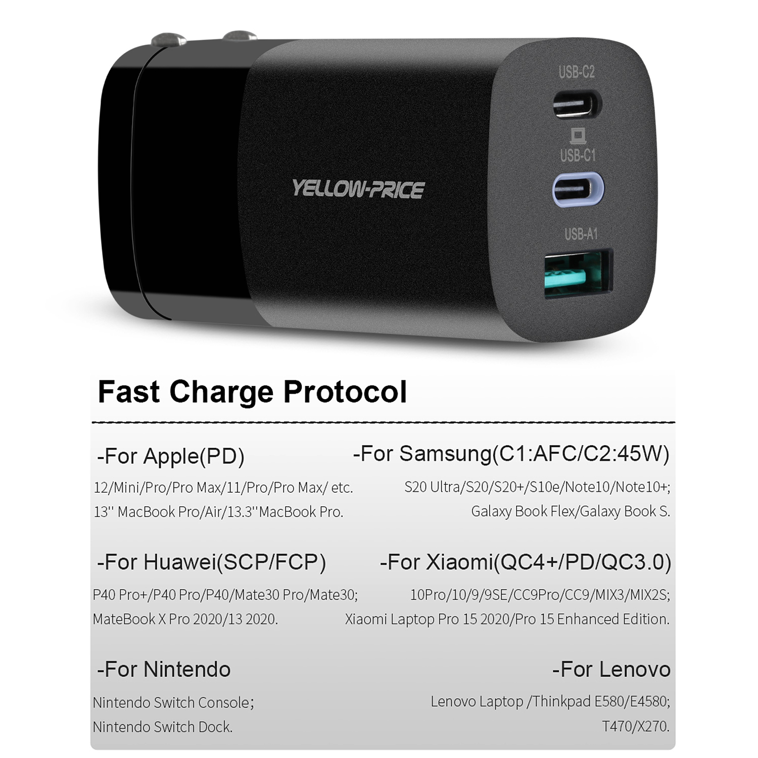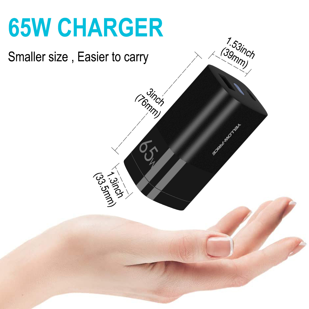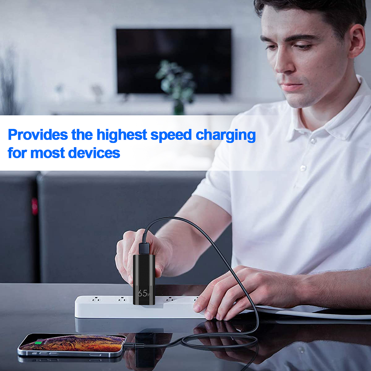 - 65W fast charge speed - Total ouput 65W charger adapter , USB C output Up to 65W(alone use) ,QC 3.0 output 60W(MAX), Hight-speed charging support for QC3.0,QC2.0,iphone PD3.0 PD2.0,Samsung AFC,Huawei FCP, Media Tek PE2.0,PE1.1,Spreadtrum SFCP,PPS, and other fast charging protocol.