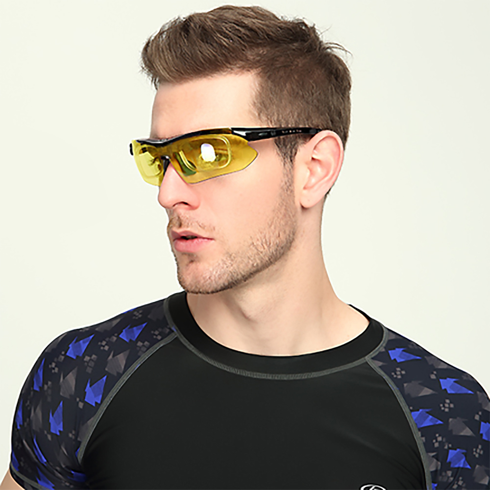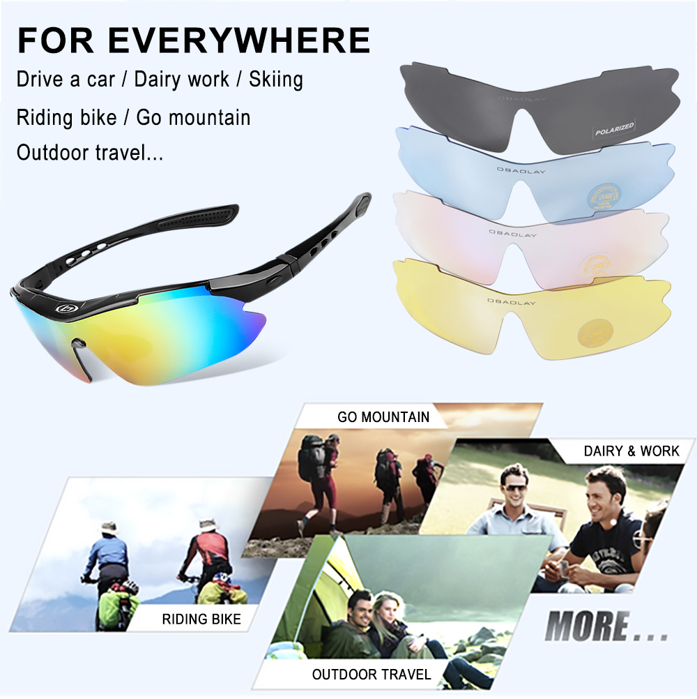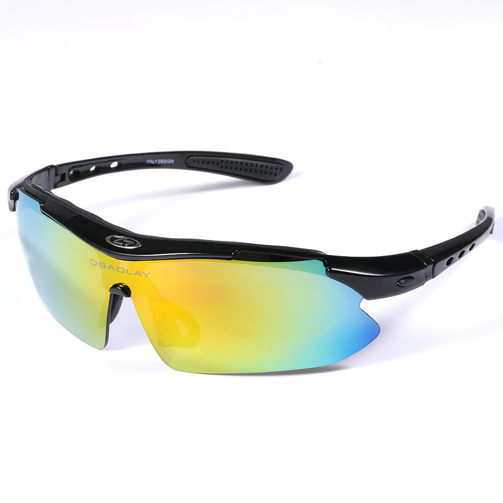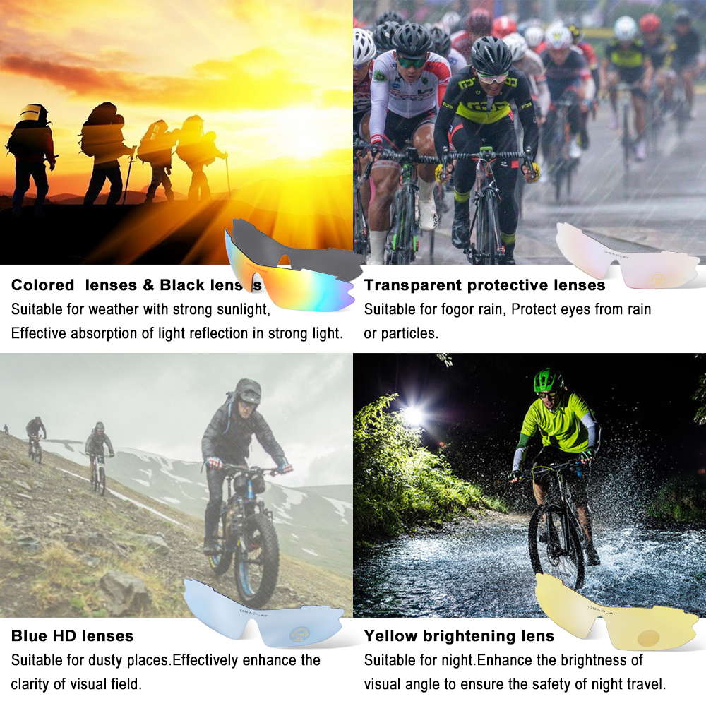 The lens of sunglasses is made of PC material, blocks 100% harmful UVA & UVB. 5 kinds of detachable lenses in different colors can adapt to different weather.The sunglasses are suitable for different sports, cycling, climbing, skiing, fishing, driving etc.