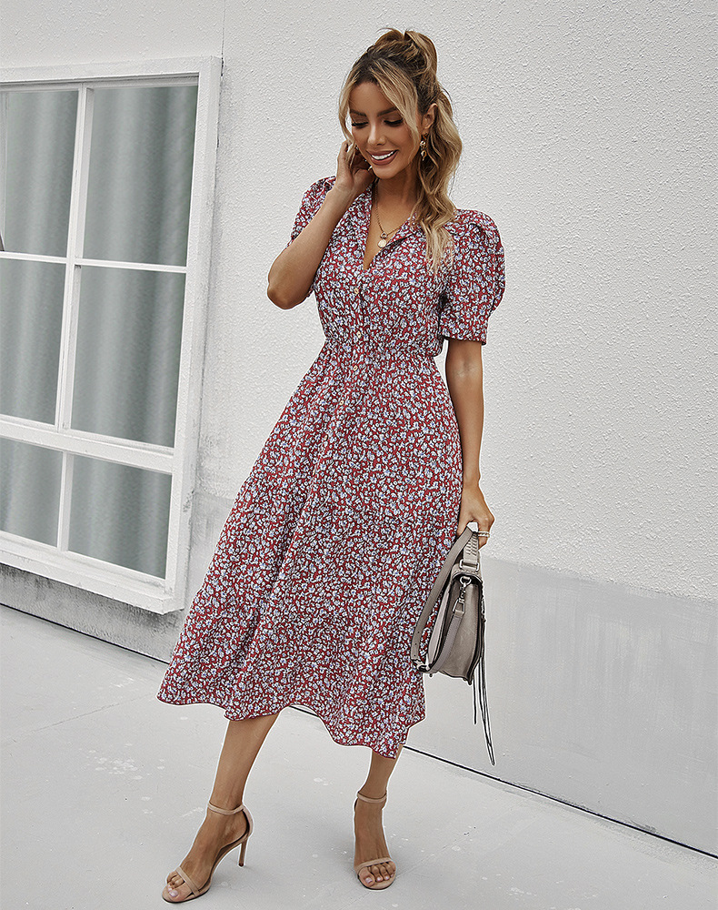 The dress is detailed with vintage puff sleeves. Features a collar, floral prints, button details, tiered skirt, A-line silhouette, and below knee length. Pair it with strappy heels and a handbag for a fantastic look.