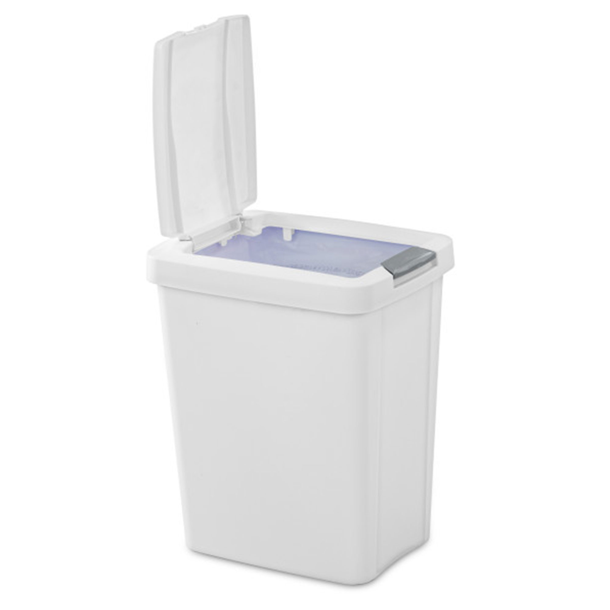 Featuring a sleek profile and polished finish, this 7.5-gallon trash can is a slim shape, designed to fit into narrow spaces for a low profile wastebasket. The special TouchTop lid opens with a touch before shutting securely. Latched shut with the titanium latch, the lid keeps contents concealed and smells contained to offer a fresher, clean smelling kitchen. This wastebasket fits a standard 8-gallon trash liner, or it can be used as a recycling bin. Utilize this slim profile garbage can for all areas of the home including bathroom, bedroom, mudroom, office and even the kitchen. Assembled dimensions of this trash can are (L x W x H) 14.5 x 11.25 x 17.75 inches.