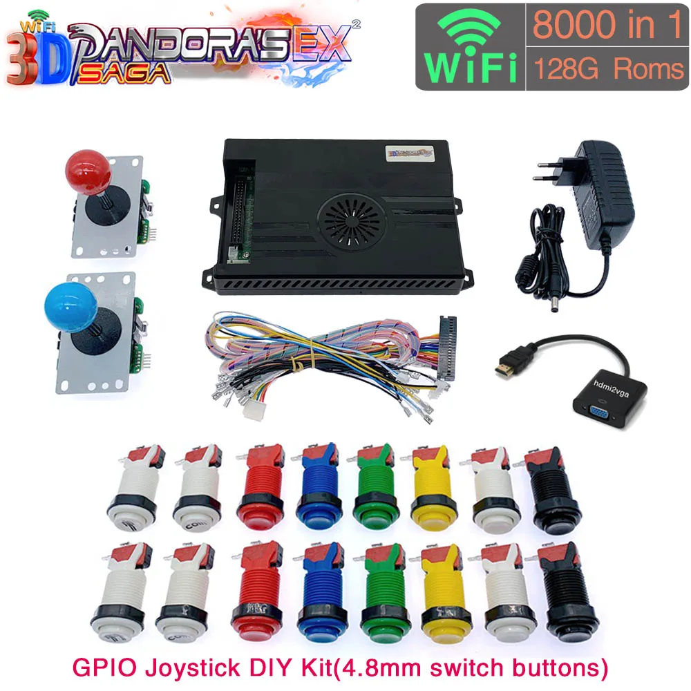 1:Game Board(3D Pandora Saga EX Family Version) ×1 2:Wire Harness Cable ×1 3:HDMI—VGA converter ×1 4:HDMI-compatible cable ×1 5:12V-DC 100-250V Wide Voltage Power Adapter ×1 6:Connection instruction ×1 7:Joysticks ×2 8:4.8mm American Arcade Buttons ×16