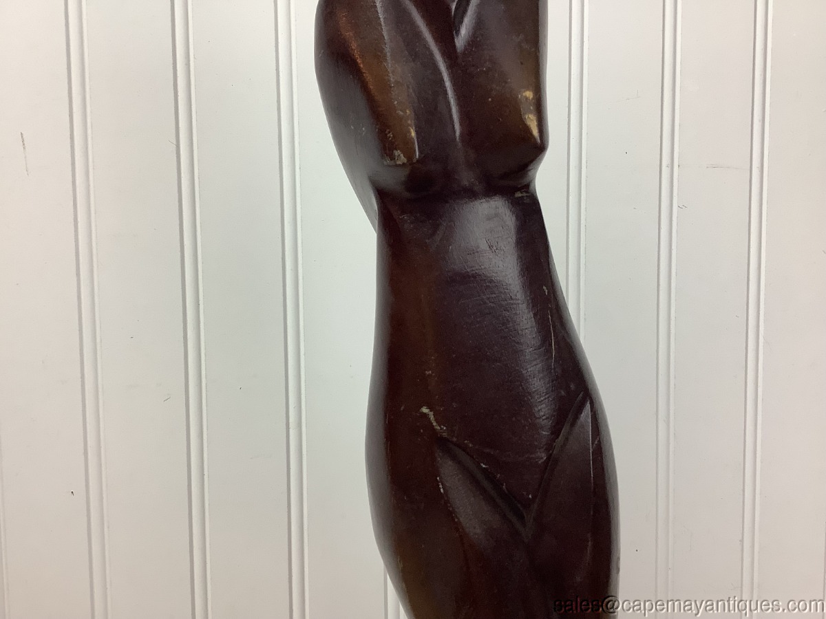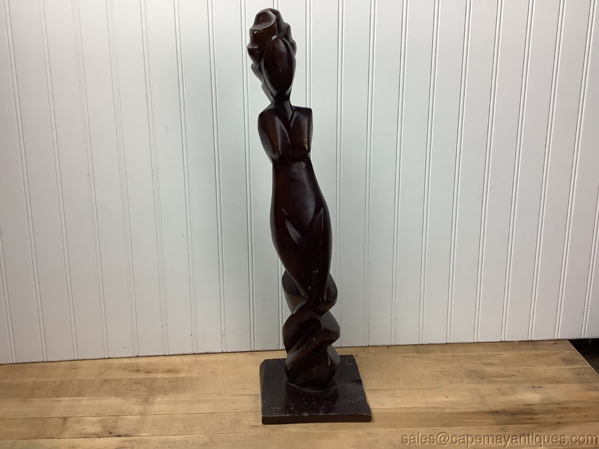 - ​Vintage Mid Century Modern Carved Wood Sculpture Female Figure MCM Dark Wood. 22 1/2" High x 6 3/8" Wide x 5 3/4" Deep at base. Stunning vintage Mid Century Modern art sculpture, carved wood of a female figure on a wood base. What an awesome piece of retro or mid century carved wood art of what appears to be decadent female, wearing a dress with her hair done up/pulled back. Perfect accent piece for a table or shelve unit. Would make a great conversation piece. The figure appears to be leaning slightly, but isn't loose/wobbly. Sculpture is nailed into a wood base. Some scuffs at the bottom. See photos. Otherwise good and clean condition.
