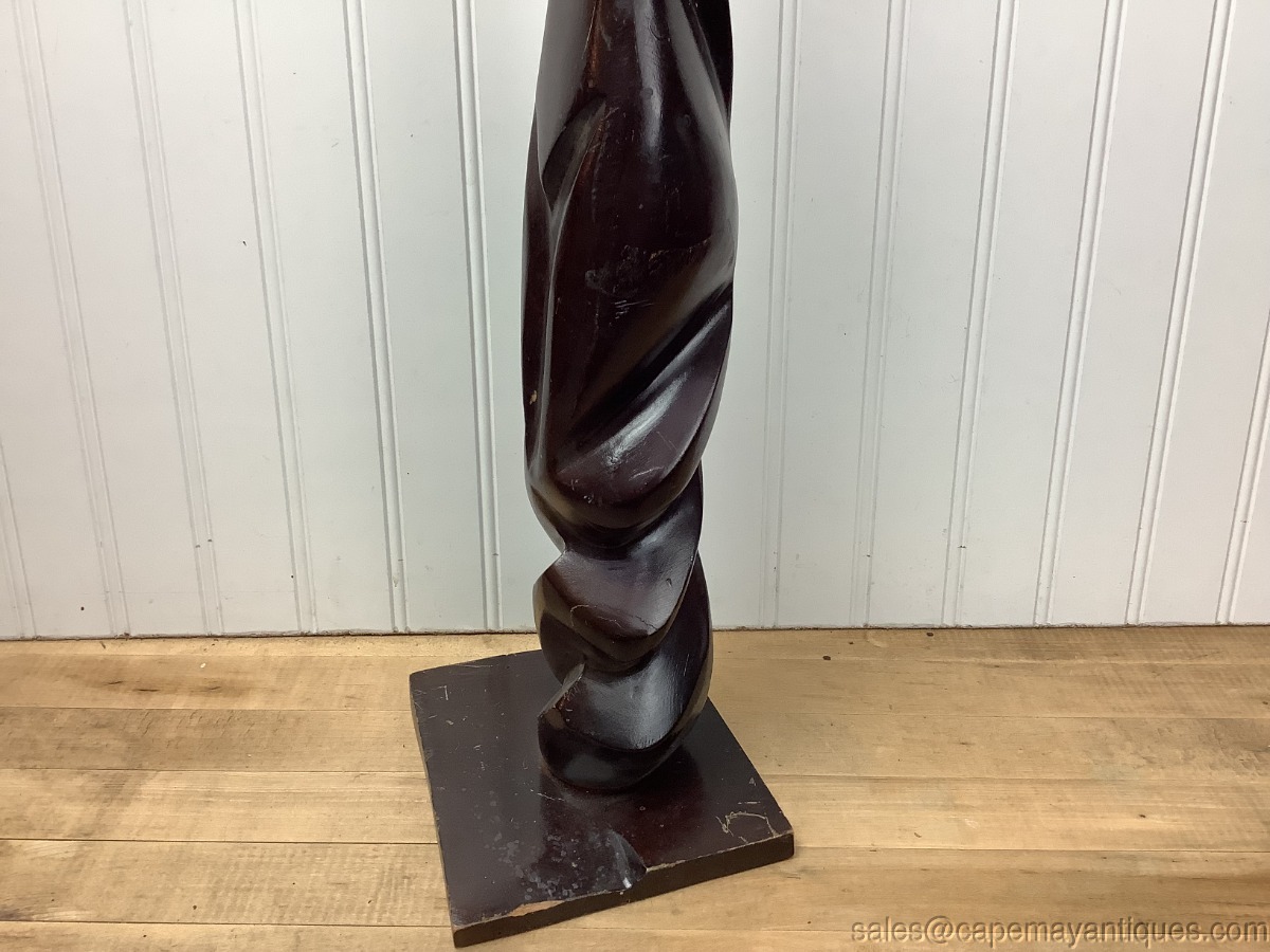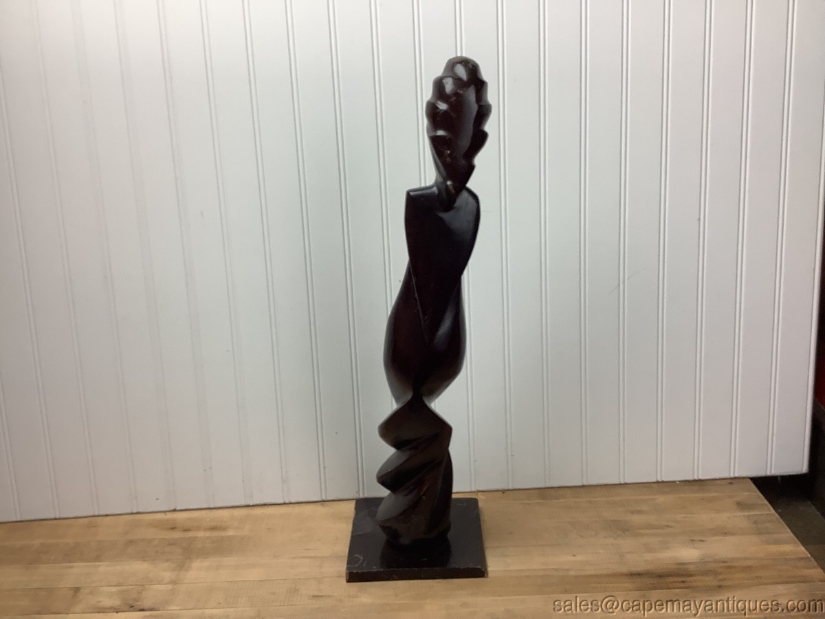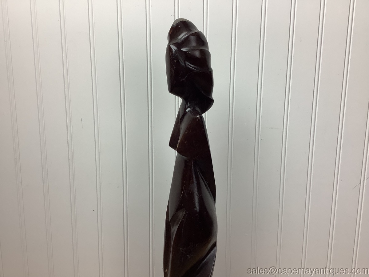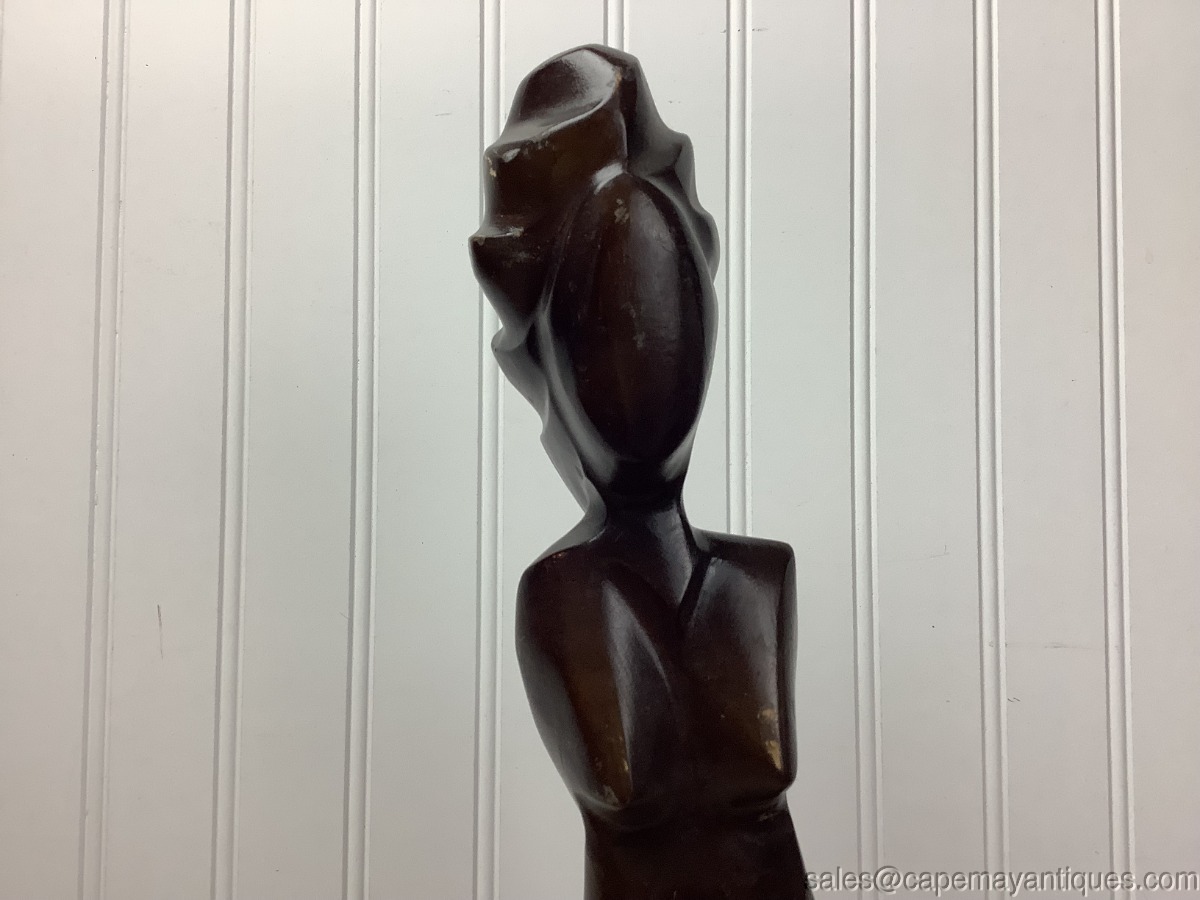 Vintage Mid Century Modern Carved Wood Sculpture Female Figure MCM Dark Wood. 22 1/2" High x 6 3/8" Wide x 5 3/4" Deep at base. Stunning vintage Mid Century Modern art sculpture, carved wood of a female figure on a wood base. What an awesome piece of retro or mid century carved wood art of what appears to be decadent female, wearing a dress with her hair done up/pulled back. Perfect accent piece for a table or shelve unit. Would make a great conversation piece. The figure appears to be leaning slightly, but isn't loose/wobbly. Sculpture is nailed into a wood base. Some scuffs at the bottom. See photos. Otherwise good and clean condition.
