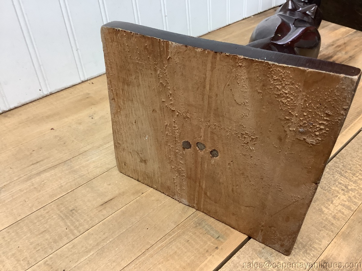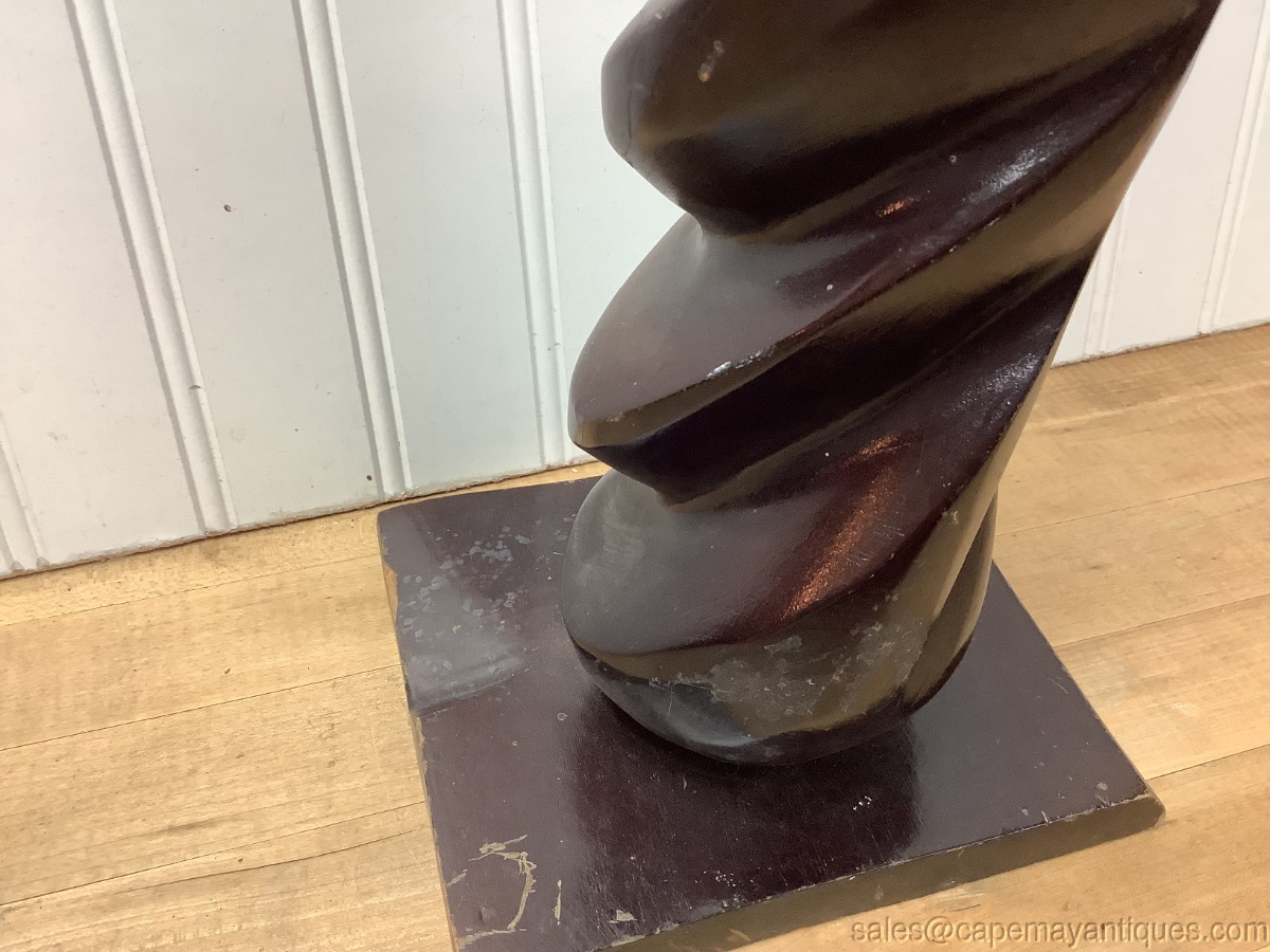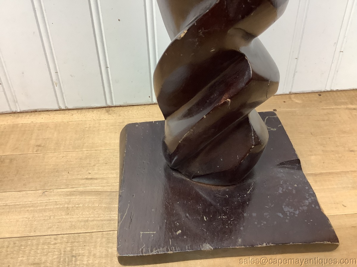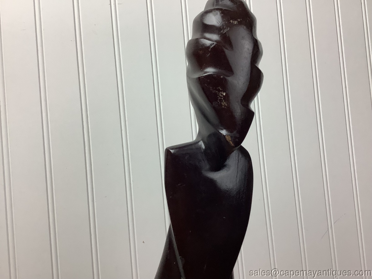 Vintage Mid Century Modern Carved Wood Sculpture Female Figure MCM Dark Wood. 22 1/2" High x 6 3/8" Wide x 5 3/4" Deep at base. Stunning vintage Mid Century Modern art sculpture, carved wood of a female figure on a wood base. What an awesome piece of retro or mid century carved wood art of what appears to be decadent female, wearing a dress with her hair done up/pulled back. Perfect accent piece for a table or shelve unit. Would make a great conversation piece. The figure appears to be leaning slightly, but isn't loose/wobbly. Sculpture is nailed into a wood base. Some scuffs at the bottom. See photos. Otherwise good and clean condition.