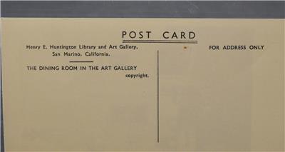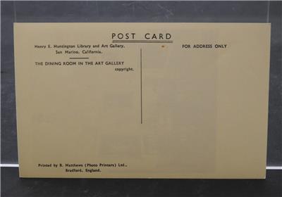 This is a vintage postcard Henry E. Huntington Library Art Gallery San Marino, California, the Dining Room In The Art Gallery. Printed by B. Matthews (Photo Printers) Ltd. Bradford, England. It is about 5 1/2 inches wide. This is in good vintage used condition!!!!