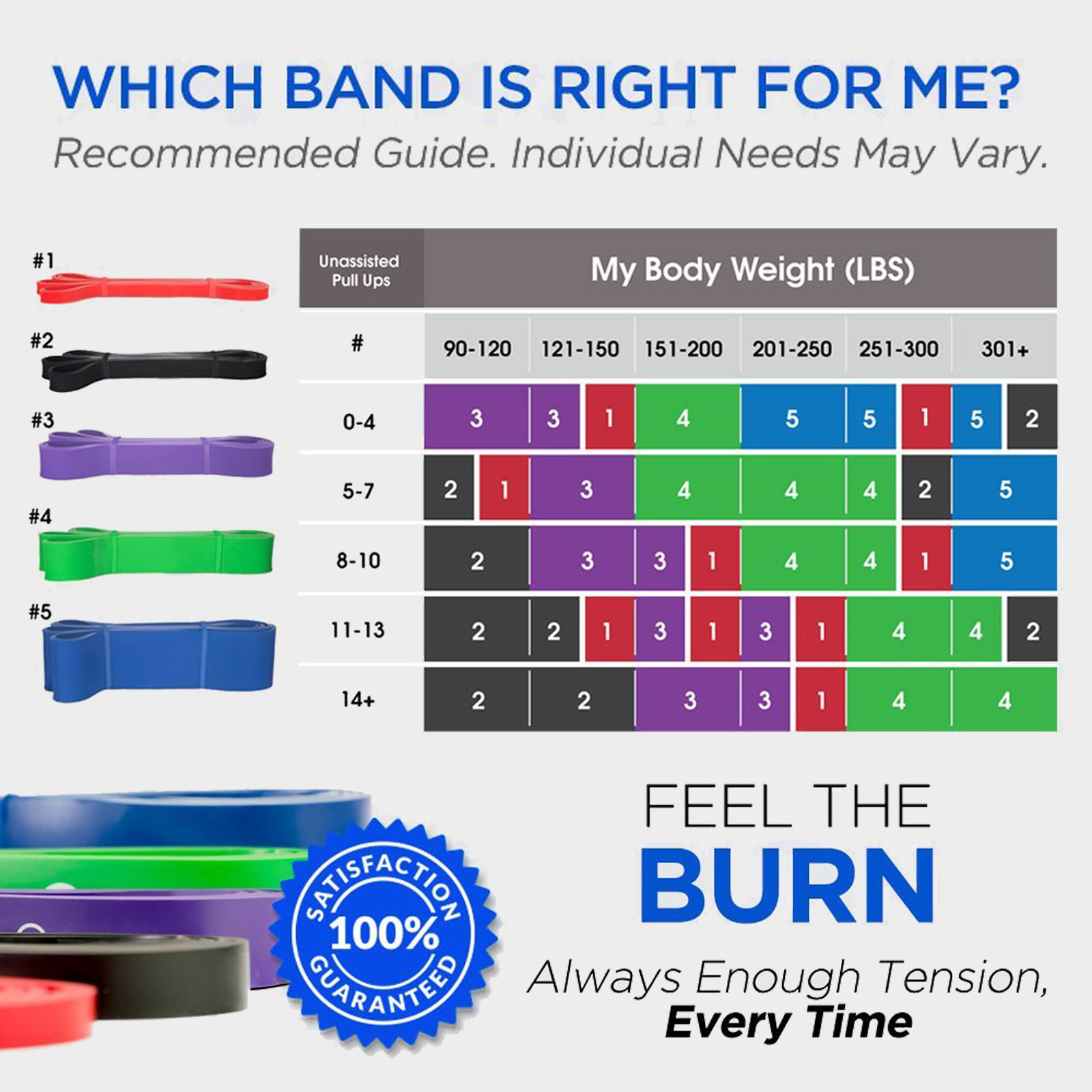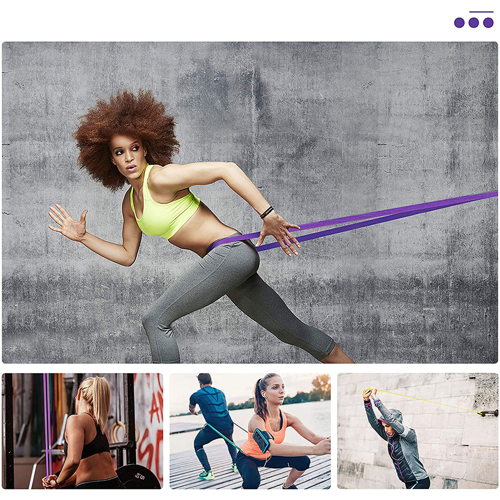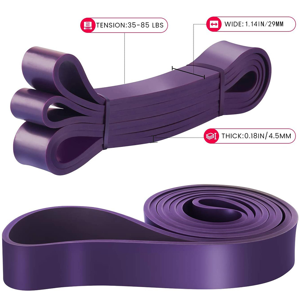 - Purple (35-85lbs): Moderate to severe resistance for moderate fitness exercises and strength training. Also suitable as medium support for pull-ups.