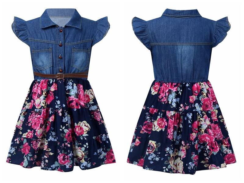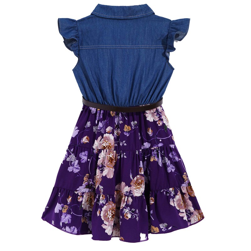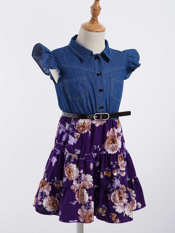 Mädchen Revers Halsumfang Flying Sleeve Front Button Verschluss Blumendruck A-Linie Kleid.