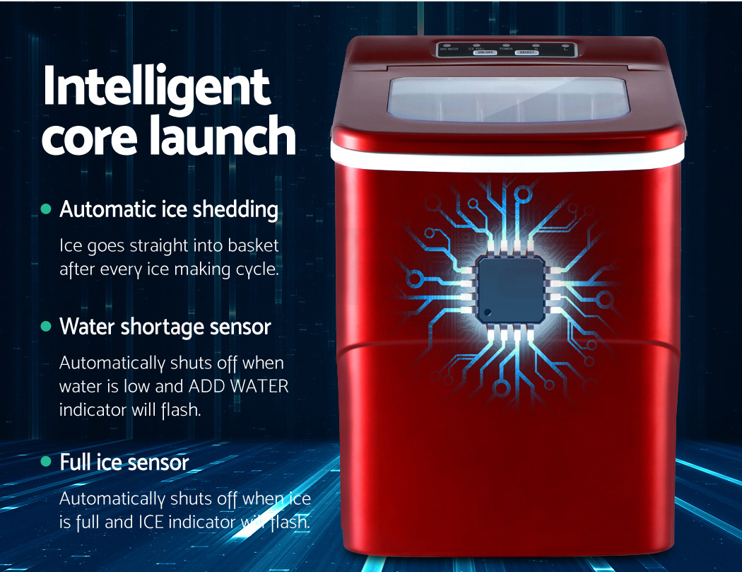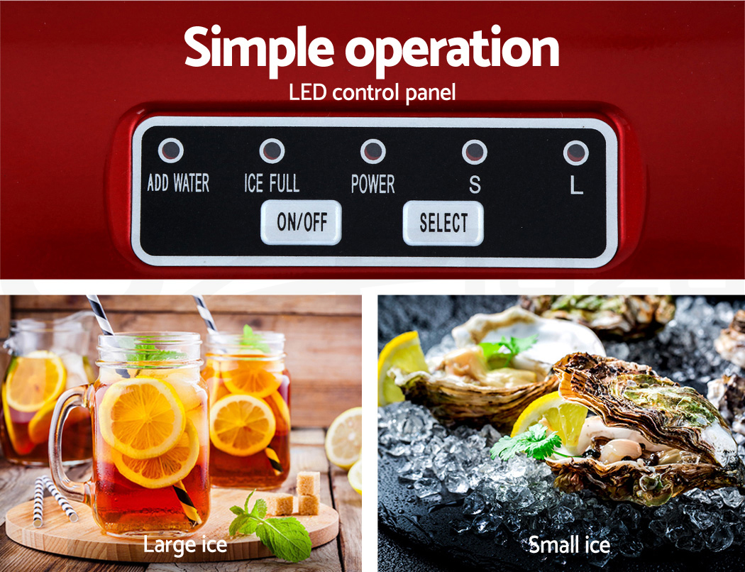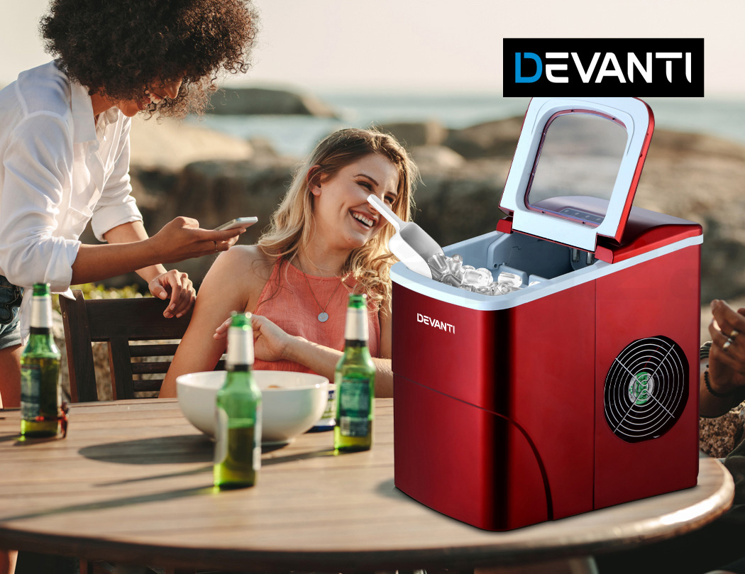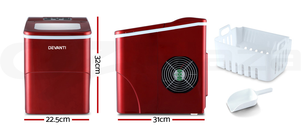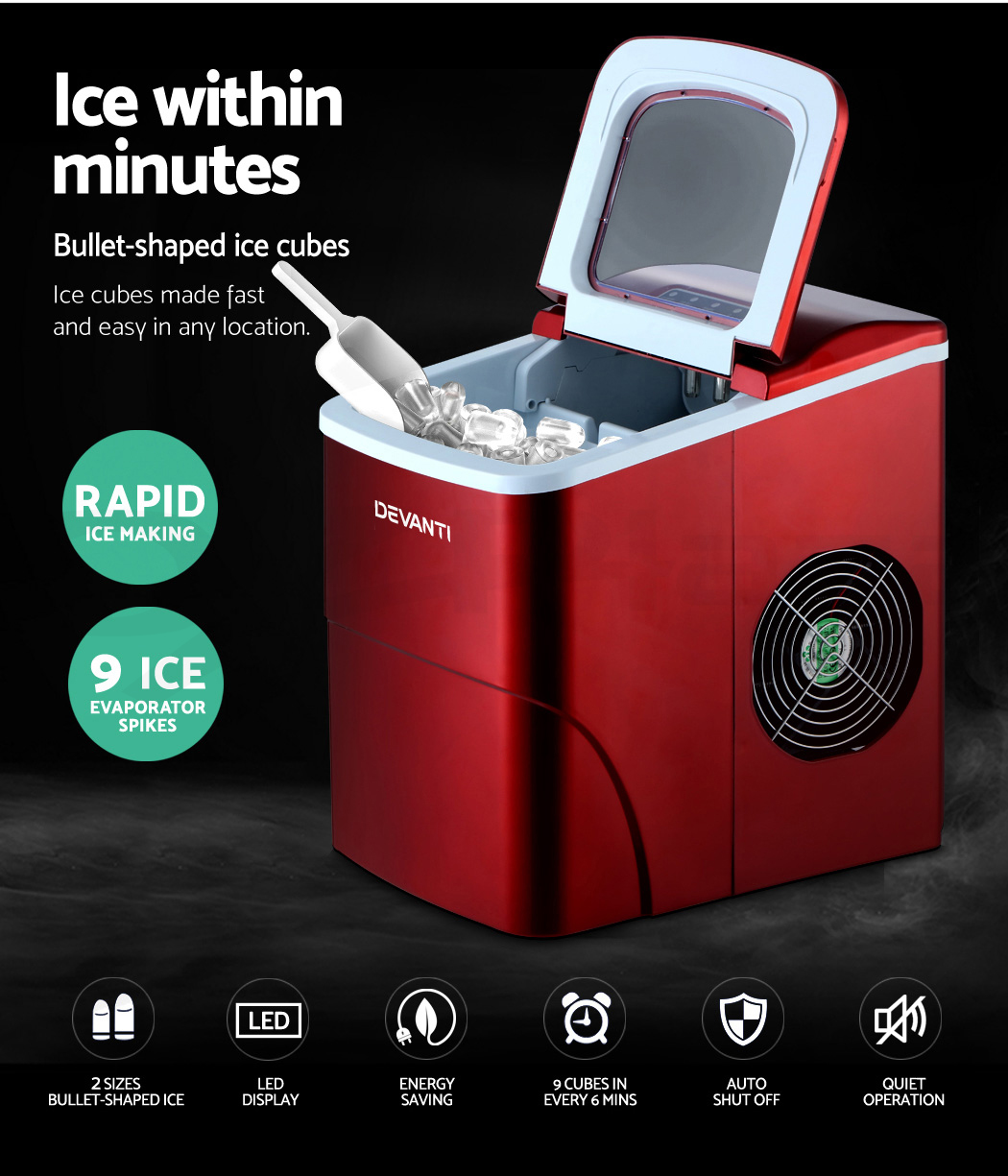 Looking for ice in a hurry? Meet our Devanti Ice Maker! Quickly produce 9 ice cubes in 6-13 minutes, with the flexibility to choose from 2 sizes. It's loaded with smart features like water shortage and ice full alarms, plus energy-saving technology through Freon-free refrigerant and enhanced heat dissipation. Its sleek, compact design fits anywhere, and with its easy-to-use controls, you’ll be enjoying cold beverages in no time. Ice at home has never been cooler!