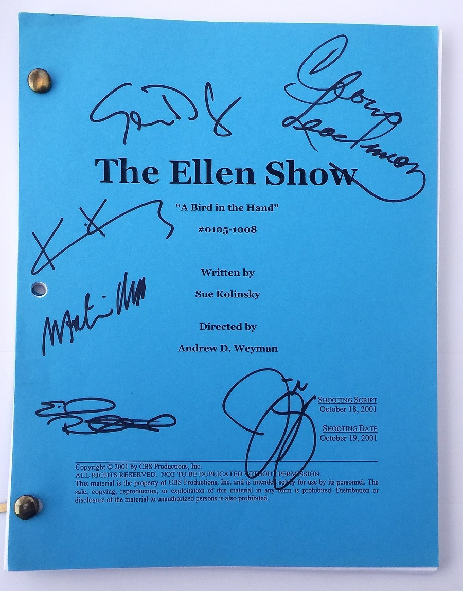 Original script for A Bird in the Hand, the 8th episode of the TV series The Ellen Show, written by Sue Kolinsky, Production #0105-1008, Shooting Script, October 18, 2001, 38 white pages plus Schedule, Cast List, Set List, and Short Rundown bound in blue wraps with two brass brads, in excellent condition. This copy is signed by the six regular cast members (Ellen DeGeneres, Jim Gaffigan, Emily Rutherford, Martin Mull, Kerri Kenney, Cloris Leachman). This script was originally sold at a charity auction around 20 years ago.