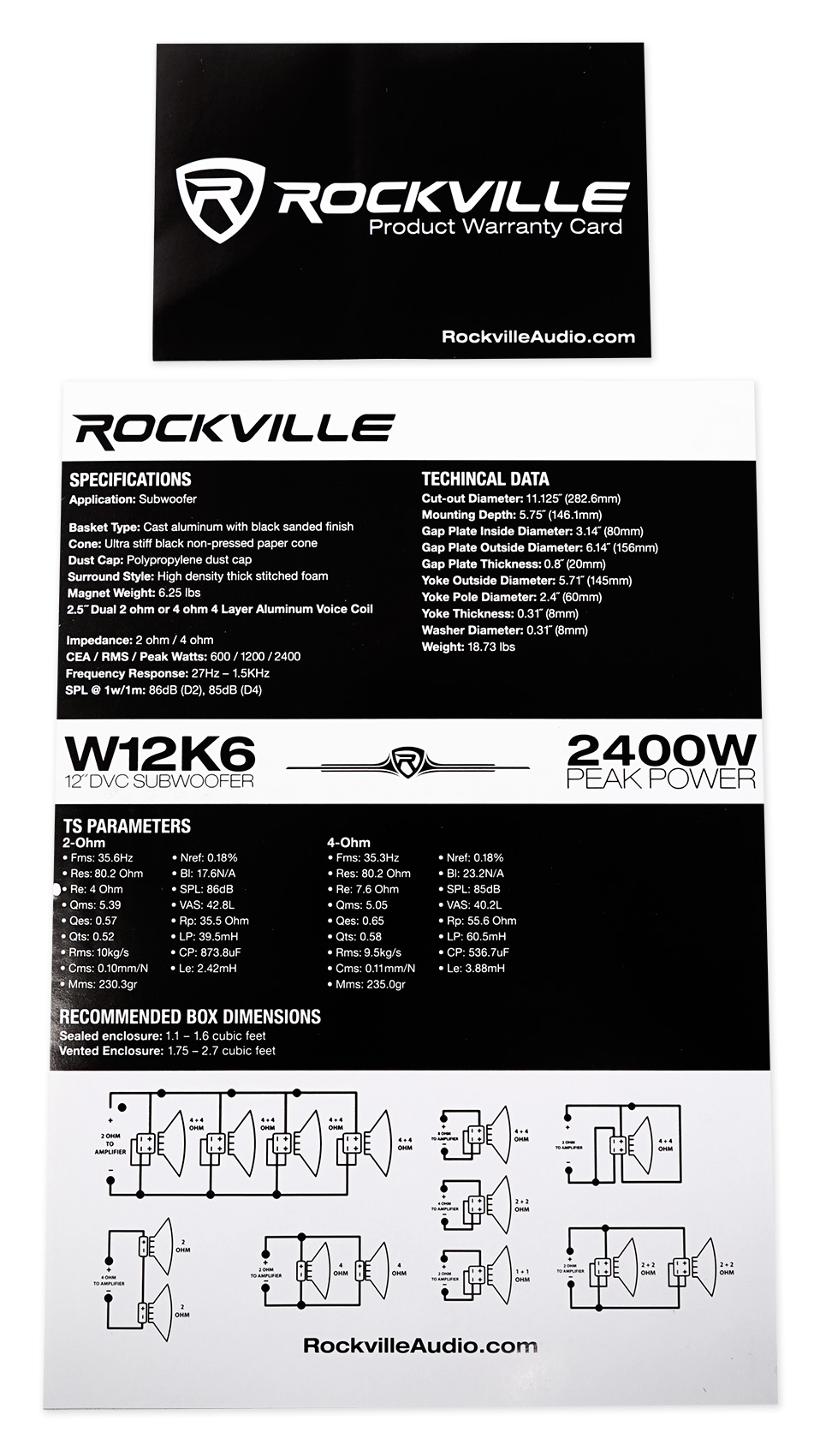 Package: Rockville W12K6D2 V2 12" 2400w Car Audio Subwoofer Dual 2-Ohm Sub CEA Compliant + Rockville RSQ12S Single 12" .75 cu.ft. MDF Sealed Subwoofer Enclosure Box - Constructed Using Grade "A" 3/4" MDF Wood, Proudly Made in America! + COMPLETE SINGLE ENCLOSURE INSTALLATION KIT WITH 14 AWG SPEAKER WIRE + DRYWOOD SCREWS + SPADE TERMINALS